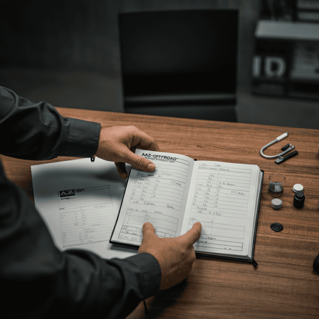 AZ-オフロードの整備記録簿に定期点検(12ヶ月・24ヶ月)の履歴が全て記載されていれば「管理の行き届いた車」と高評価。特にエンジンオイル交換履歴は重要で+6~9万円の効果。