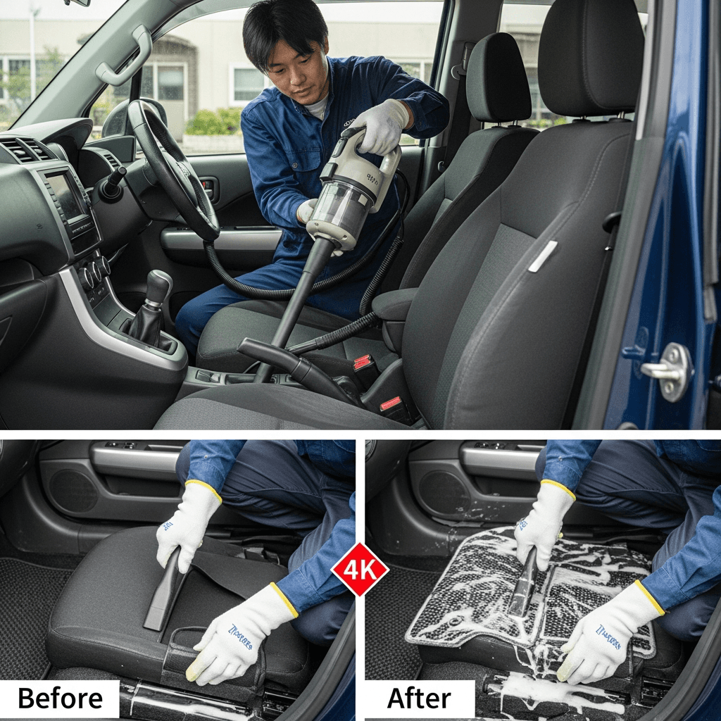 bBは第一印象が査定の8割を決めます。シート隙間のゴミ除去、マット洗浄、樹脂パーツ艶出しで新車級の清潔感に。特に臭いゼロなら「禁煙車」扱いで+5~8万円UP。
