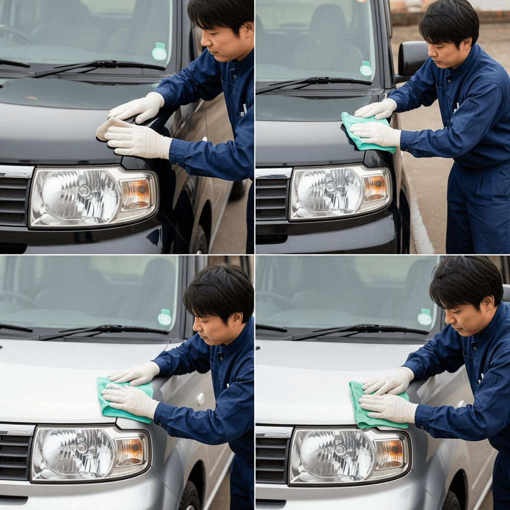 bBはヘッドライトの黄ばみとボディの鉄粉が第一印象を損ねます。研磨+鉄粉除去クリーナー+ワックスで輝きを取り戻せば「程度良好」と判断され+4~7万円の効果。