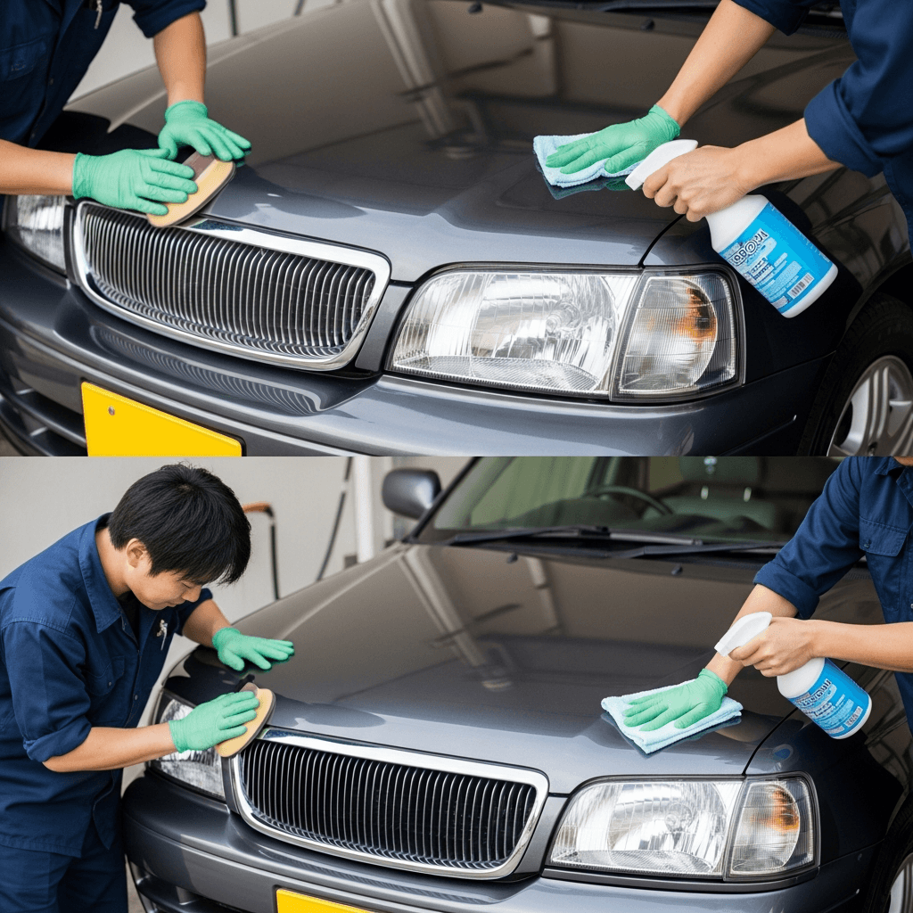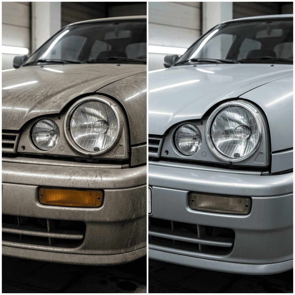 Be-1はヘッドライトの黄ばみとボディの鉄粉が第一印象を損ねます。研磨+鉄粉除去クリーナー+ワックスで輝きを取り戻せば「程度良好」と判断され+4~7万円の効果。