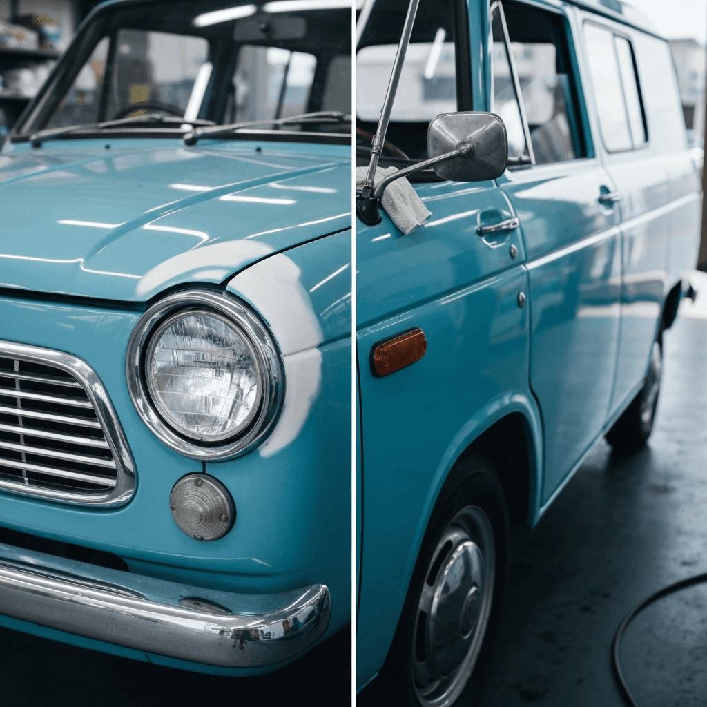 ブルーバードオージィーはヘッドライトの黄ばみとボディの鉄粉が第一印象を損ねます。研磨+鉄粉除去クリーナー+ワックスで輝きを取り戻せば「程度良好」と判断され+4~7万円の効果。