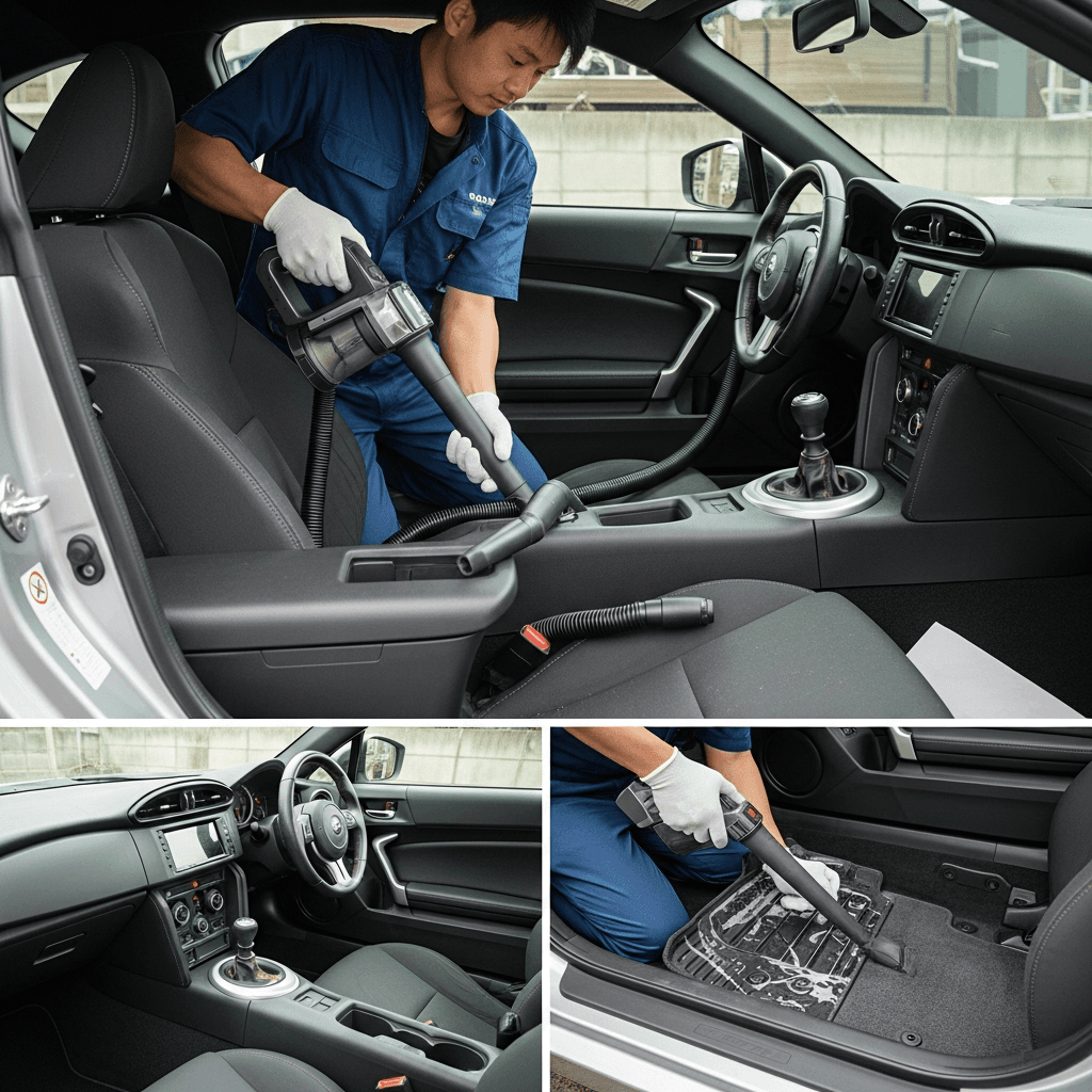 BRZは第一印象が査定の8割を決めます。シート隙間のゴミ除去、マット洗浄、樹脂パーツ艶出しで新車級の清潔感に。特に臭いゼロなら「禁煙車」扱いで+5~8万円UP。