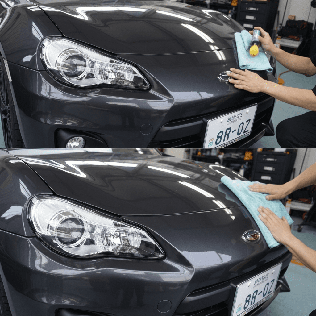 BRZはヘッドライトの黄ばみとボディの鉄粉が第一印象を損ねます。研磨+鉄粉除去クリーナー+ワックスで輝きを取り戻せば「程度良好」と判断され+4~7万円の効果。