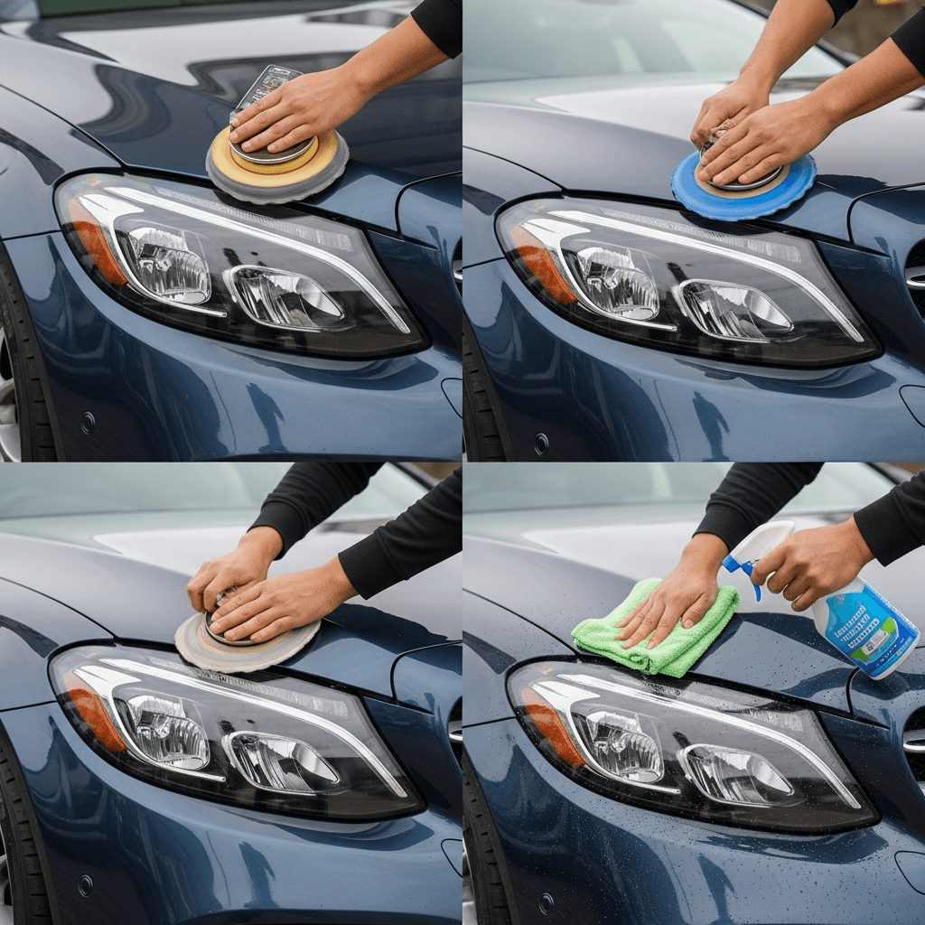 Cクラスオールテレインはヘッドライトの黄ばみとボディの鉄粉が第一印象を損ねます。研磨+鉄粉除去クリーナー+ワックスで輝きを取り戻せば「程度良好」と判断され+4~7万円の効果。