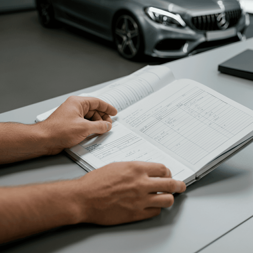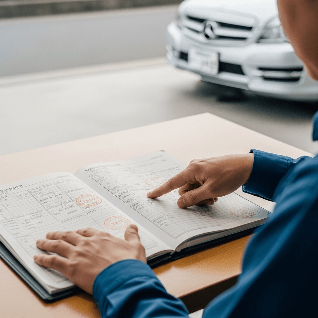 Cクラスクーペの整備記録簿に定期点検(12ヶ月・24ヶ月)の履歴が全て記載されていれば「管理の行き届いた車」と高評価。特にエンジンオイル交換履歴は重要で+6~9万円の効果。