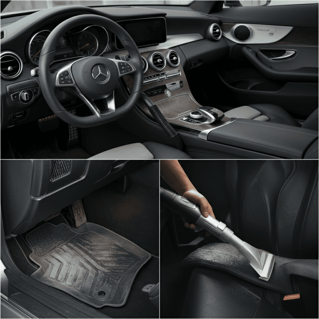 Cクラスクーペは第一印象が査定の8割を決めます。シート隙間のゴミ除去、マット洗浄、樹脂パーツ艶出しで新車級の清潔感に。特に臭いゼロなら「禁煙車」扱いで+5~8万円UP。