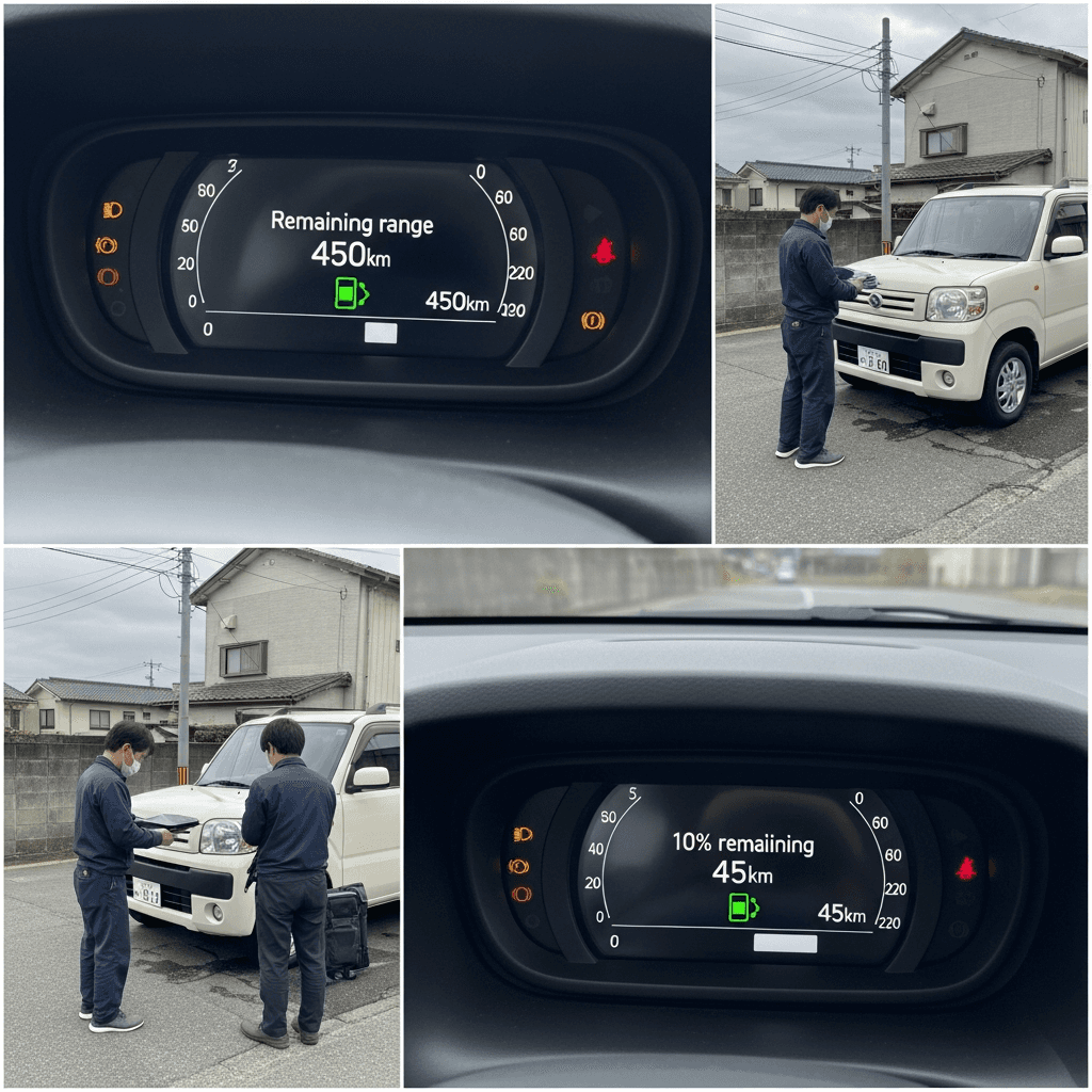 満充電から通常走行→残量10%までの実測データ(写真+メモ)を提示すれば「カタログ値通り」の信頼獲得。航続距離不安が購入障壁のEV車で+5~8万円の効果。