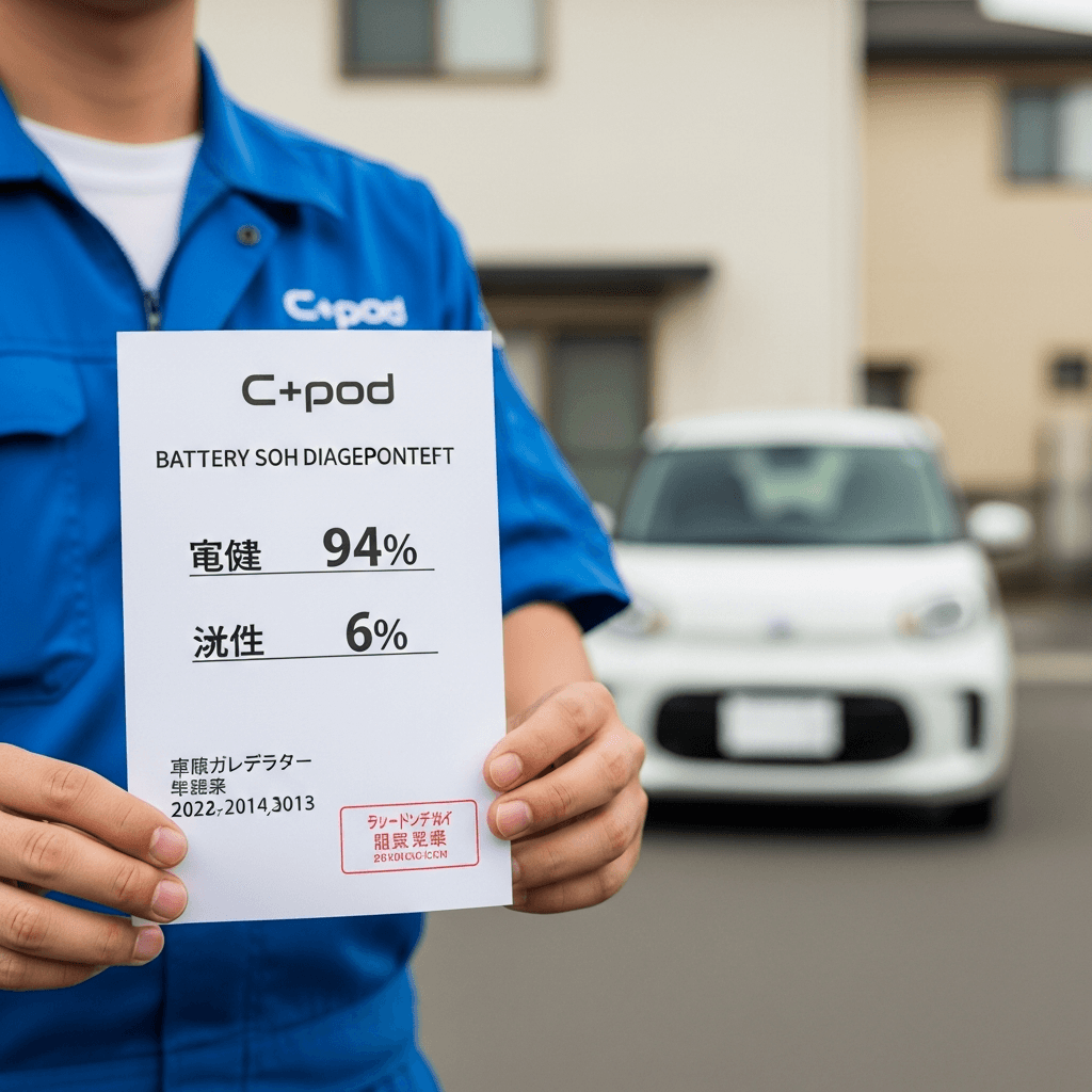 EVの最大不安はバッテリー劣化。ディーラーでSOH(バッテリー健全性)診断を受け、「90%以上」の証明書があれば査定額が劇的にUP。診断費用5,000円で+12~20万円のリターンが期待できます。