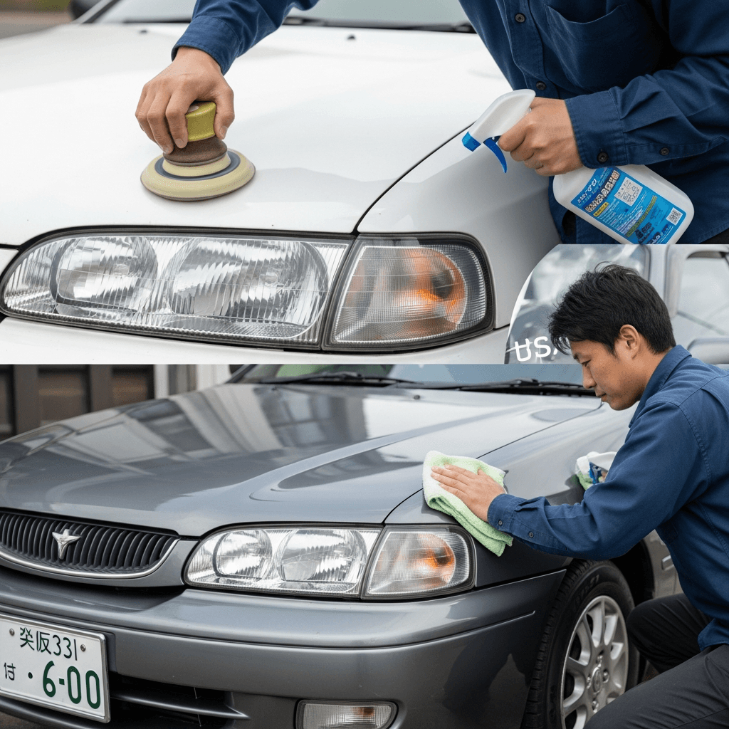 カルディナはヘッドライトの黄ばみとボディの鉄粉が第一印象を損ねます。研磨+鉄粉除去クリーナー+ワックスで輝きを取り戻せば「程度良好」と判断され+4~7万円の効果。