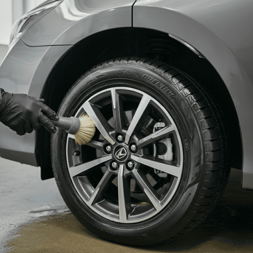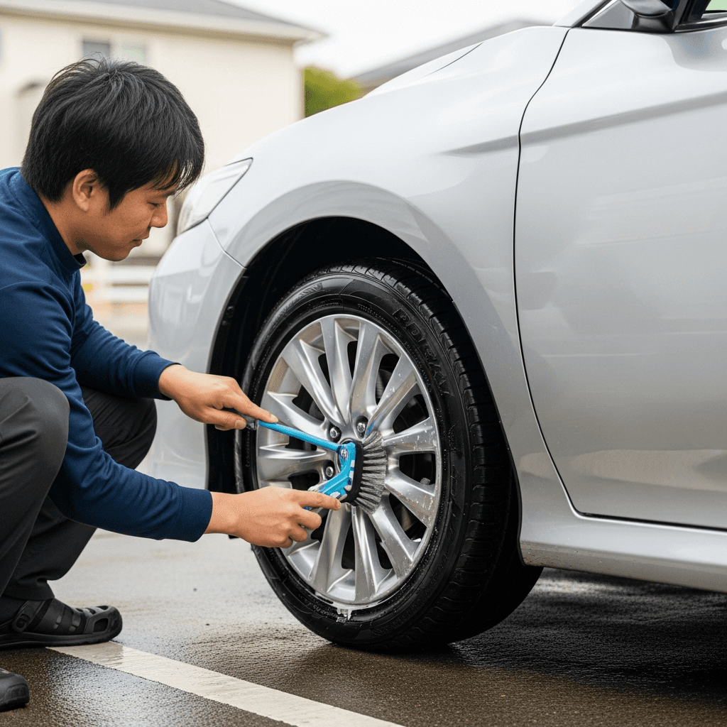セダンは純正アルミホイールの傷が目立ちやすい。ホイールクリーナーで洗浄+タイヤ溝5mm以上確保で「足回り良好」評価。特にカムリグラシアは高級感が重要で+6~9万円の効果。