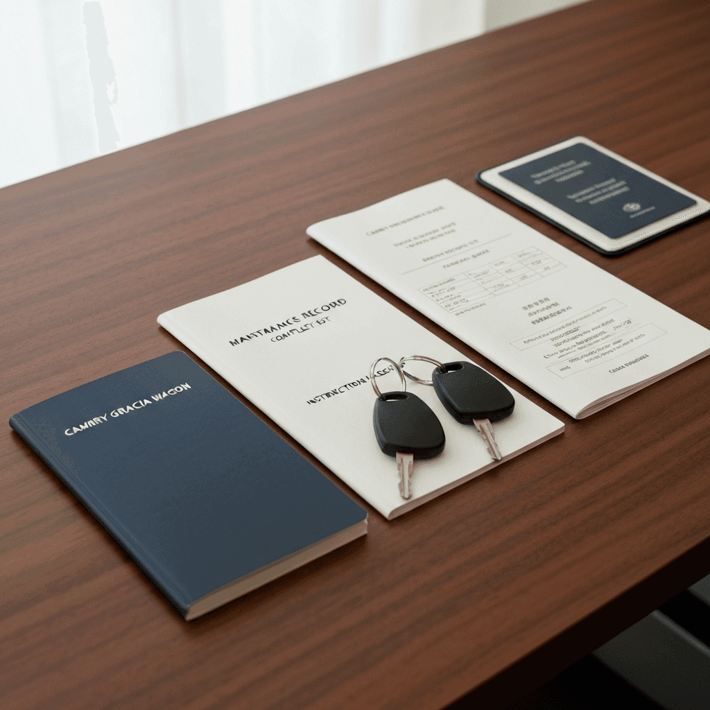 カムリグラシアワゴンは高級セダンとして書類完備が必須。整備記録簿、取扱説明書、スペアキー2本が揃っていれば「ワンオーナー級の管理」で+4~7万円UP。特にスペアキーは重要。