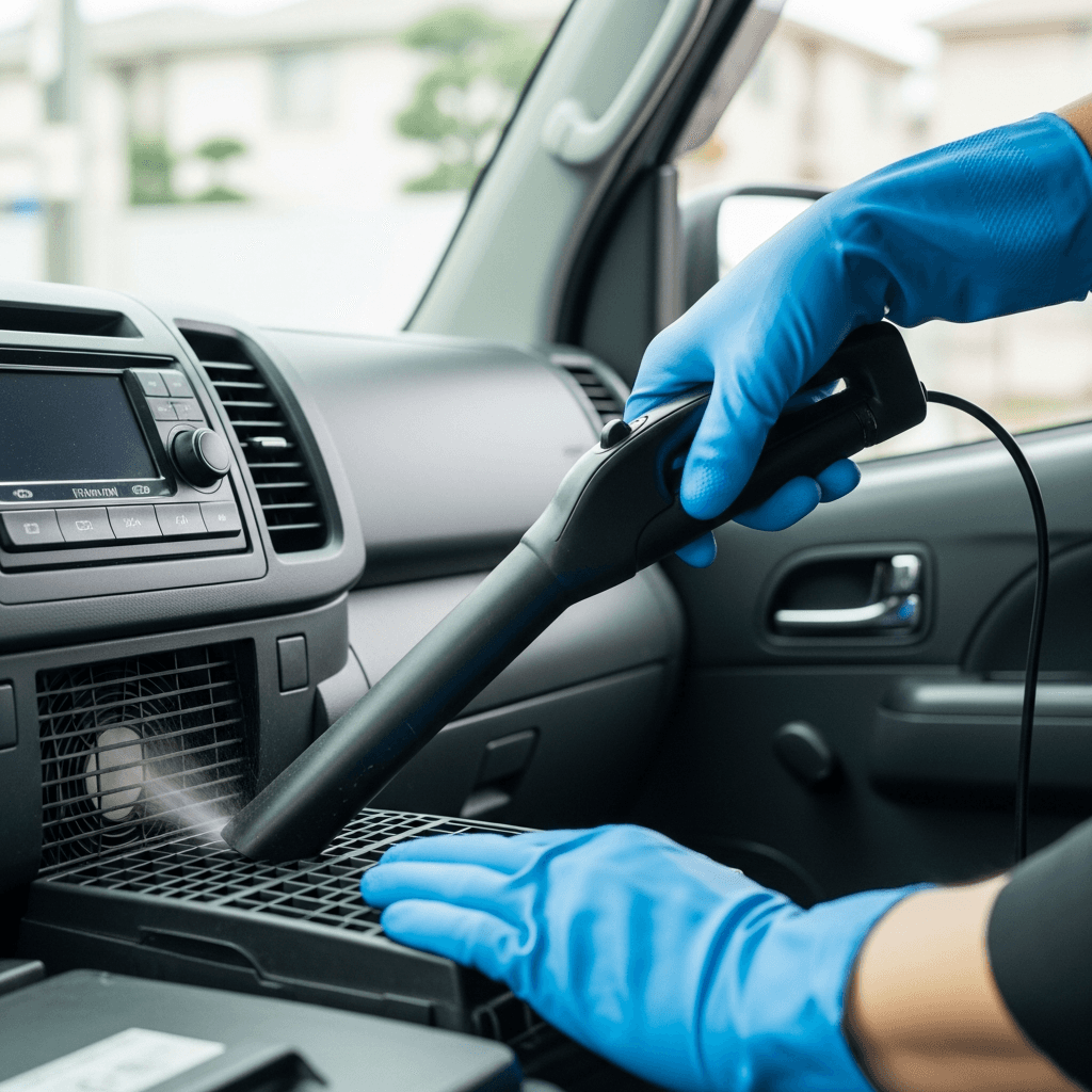 キャンターエコハイブリッドのハイブリッドシステムは冷却が命。後席下または荷室のバッテリー冷却ファン吸入口を掃除機で丁寧に清掃すれば「バッテリー管理完璧」の印象を与え、HV特有の不安を払拭。5分の作業で+5~8万円の効果が期待できます。