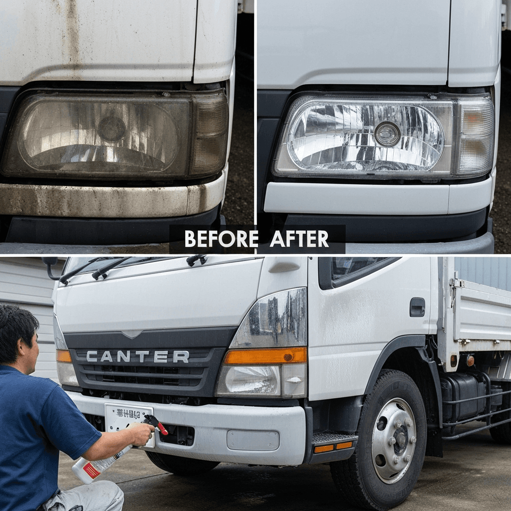 キャンターガッツはヘッドライトの黄ばみとボディの鉄粉が第一印象を損ねます。研磨+鉄粉除去クリーナー+ワックスで輝きを取り戻せば「程度良好」と判断され+4~7万円の効果。
