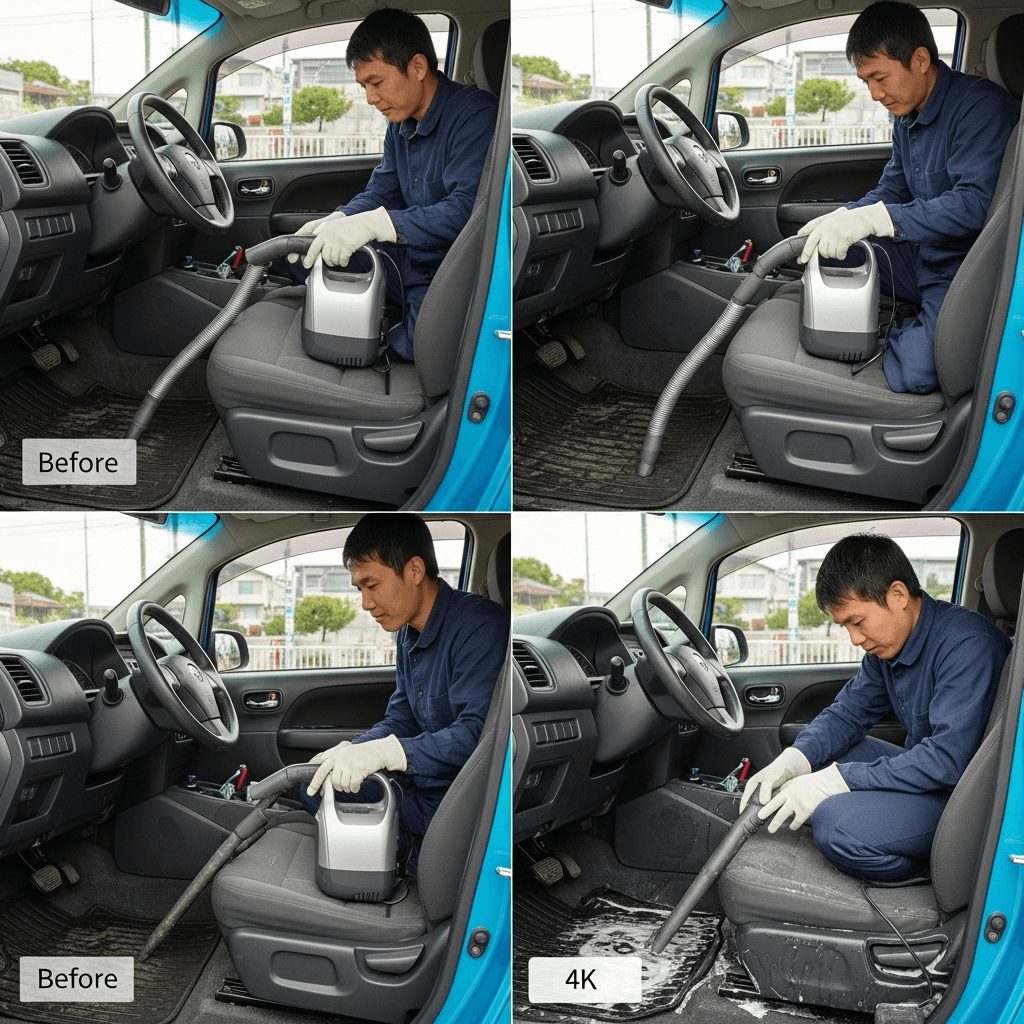 カペラカーゴは第一印象が査定の8割を決めます。シート隙間のゴミ除去、マット洗浄、樹脂パーツ艶出しで新車級の清潔感に。特に臭いゼロなら「禁煙車」扱いで+5~8万円UP。