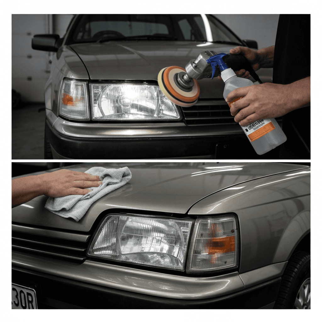 カリーナサーフはヘッドライトの黄ばみとボディの鉄粉が第一印象を損ねます。研磨+鉄粉除去クリーナー+ワックスで輝きを取り戻せば「程度良好」と判断され+4~7万円の効果。