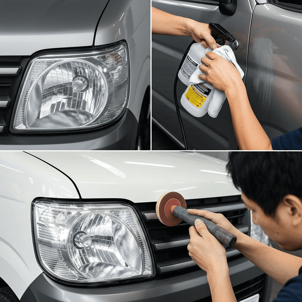 キャリイはヘッドライトの黄ばみとボディの鉄粉が第一印象を損ねます。研磨+鉄粉除去クリーナー+ワックスで輝きを取り戻せば「程度良好」と判断され+4~7万円の効果。