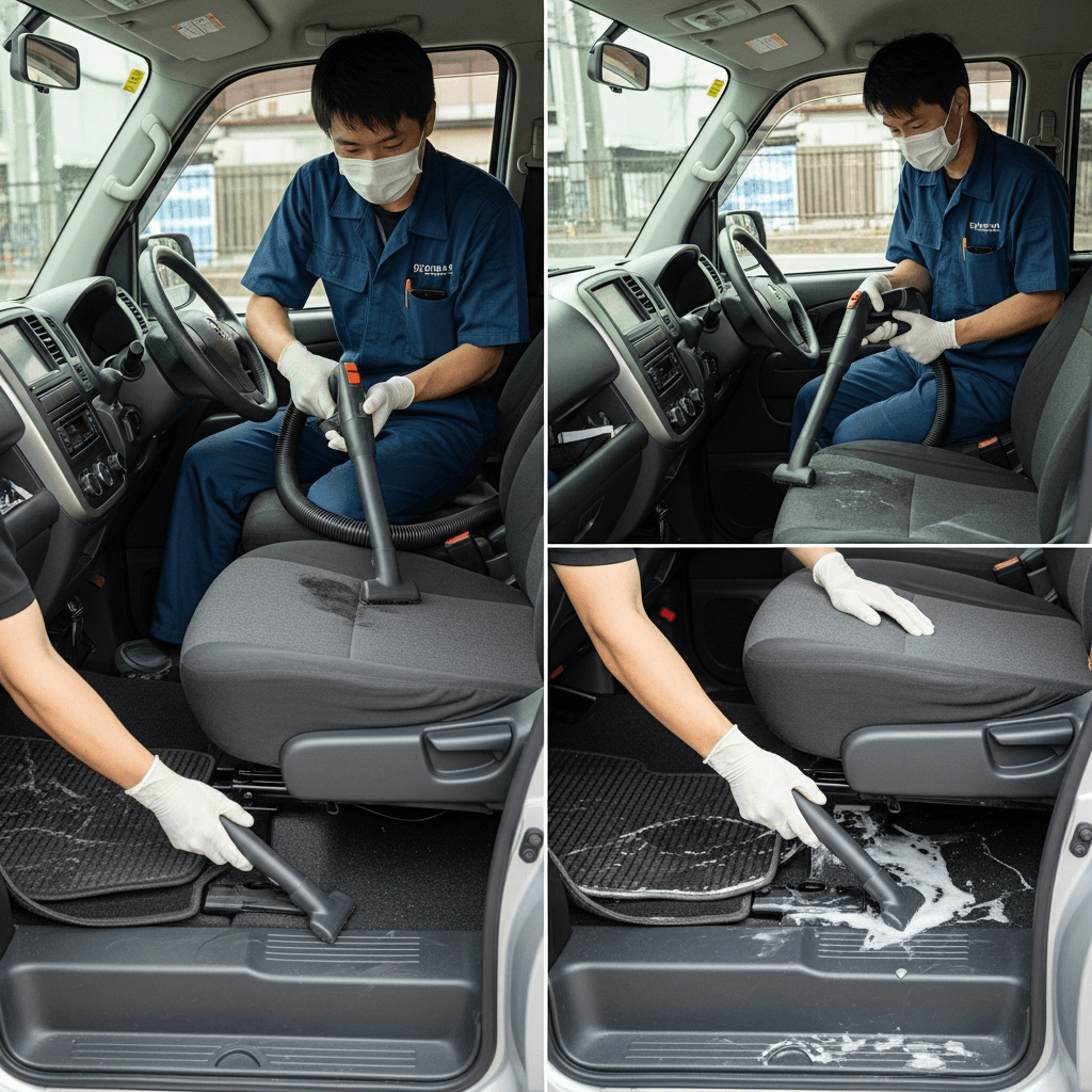 キャリイバンは第一印象が査定の8割を決めます。シート隙間のゴミ除去、マット洗浄、樹脂パーツ艶出しで新車級の清潔感に。特に臭いゼロなら「禁煙車」扱いで+5~8万円UP。
