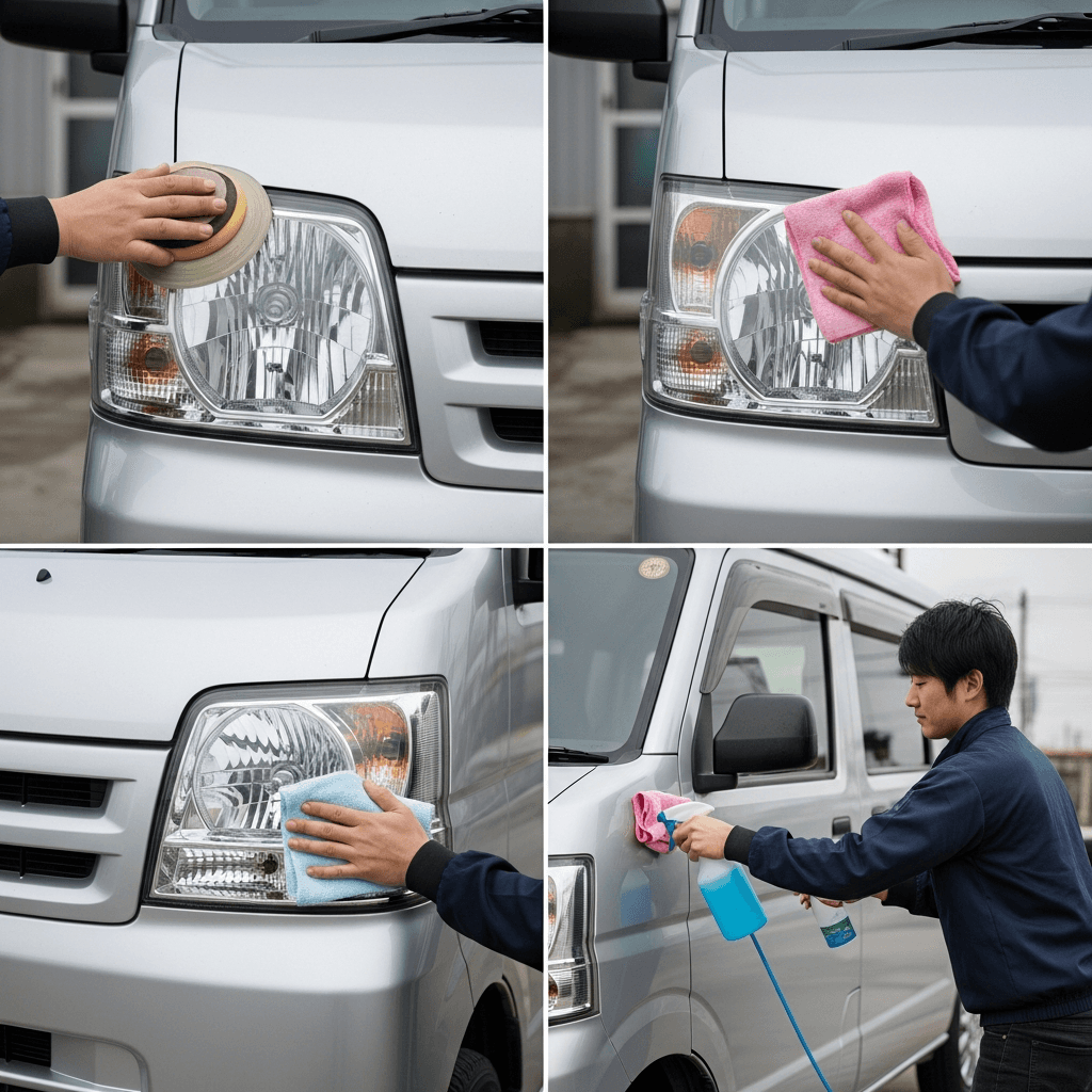 キャリイバンはヘッドライトの黄ばみとボディの鉄粉が第一印象を損ねます。研磨+鉄粉除去クリーナー+ワックスで輝きを取り戻せば「程度良好」と判断され+4~7万円の効果。