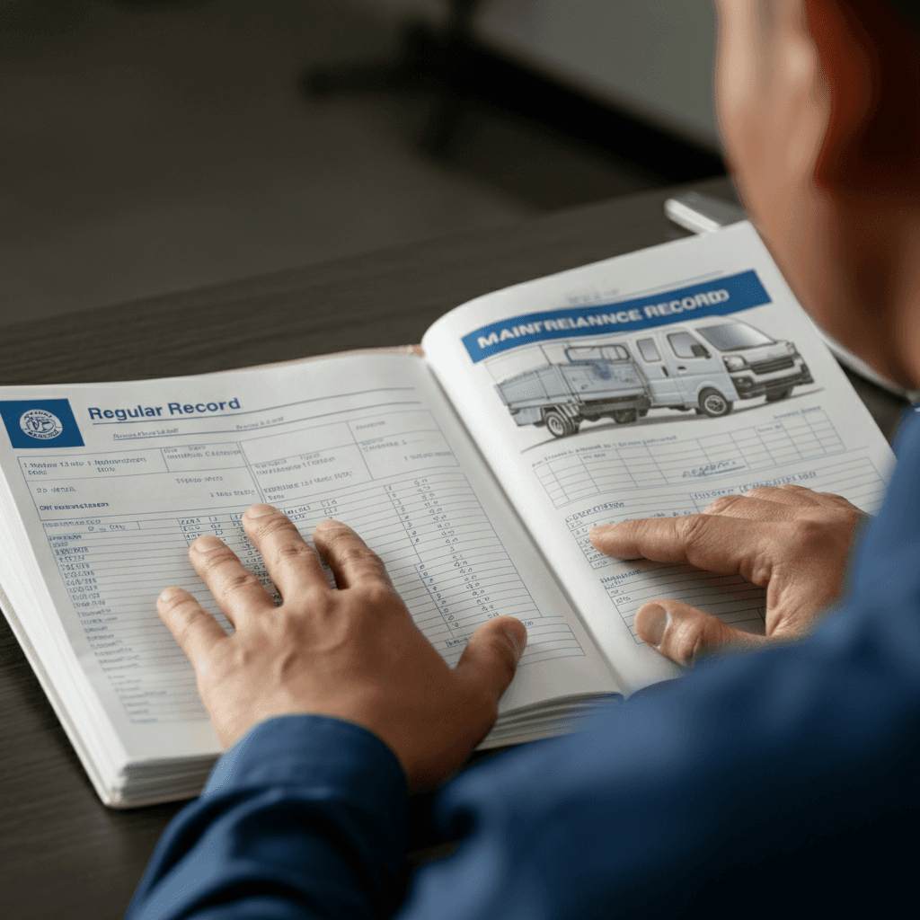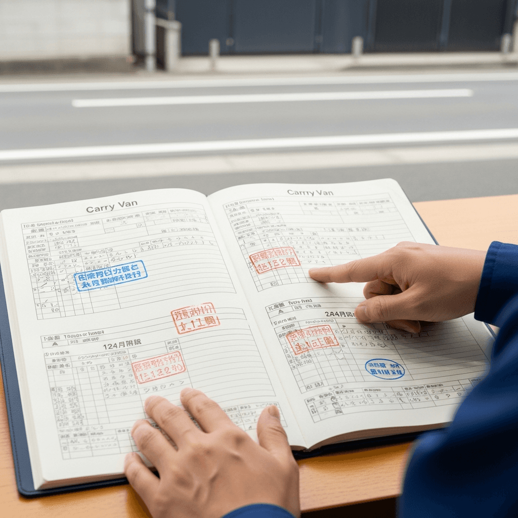 キャリイバンの整備記録簿に定期点検(12ヶ月・24ヶ月)の履歴が全て記載されていれば「管理の行き届いた車」と高評価。特にエンジンオイル交換履歴は重要で+6~9万円の効果。