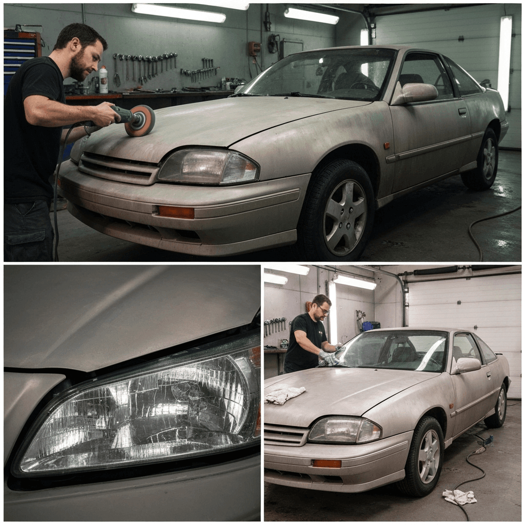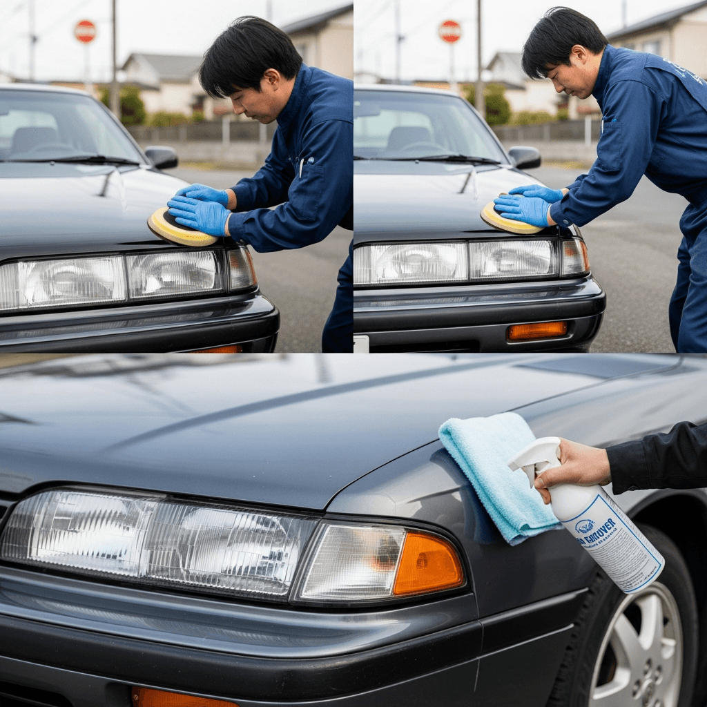 キャバリエクーペはヘッドライトの黄ばみとボディの鉄粉が第一印象を損ねます。研磨+鉄粉除去クリーナー+ワックスで輝きを取り戻せば「程度良好」と判断され+4~7万円の効果。