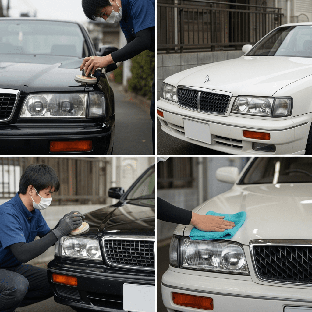 セドリックセダンはヘッドライトの黄ばみとボディの鉄粉が第一印象を損ねます。研磨+鉄粉除去クリーナー+ワックスで輝きを取り戻せば「程度良好」と判断され+4~7万円の効果。