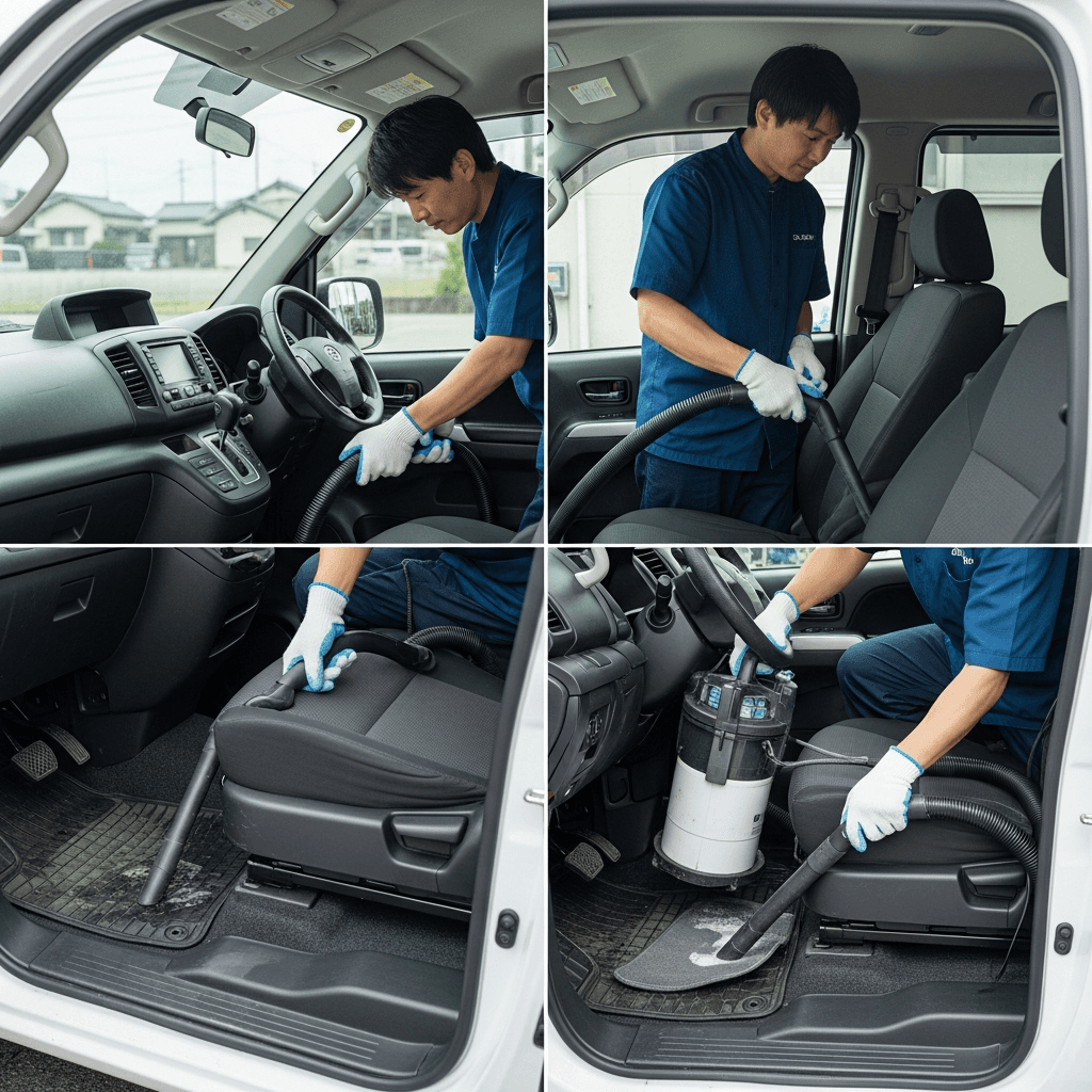 セドリックバンは第一印象が査定の8割を決めます。シート隙間のゴミ除去、マット洗浄、樹脂パーツ艶出しで新車級の清潔感に。特に臭いゼロなら「禁煙車」扱いで+5~8万円UP。
