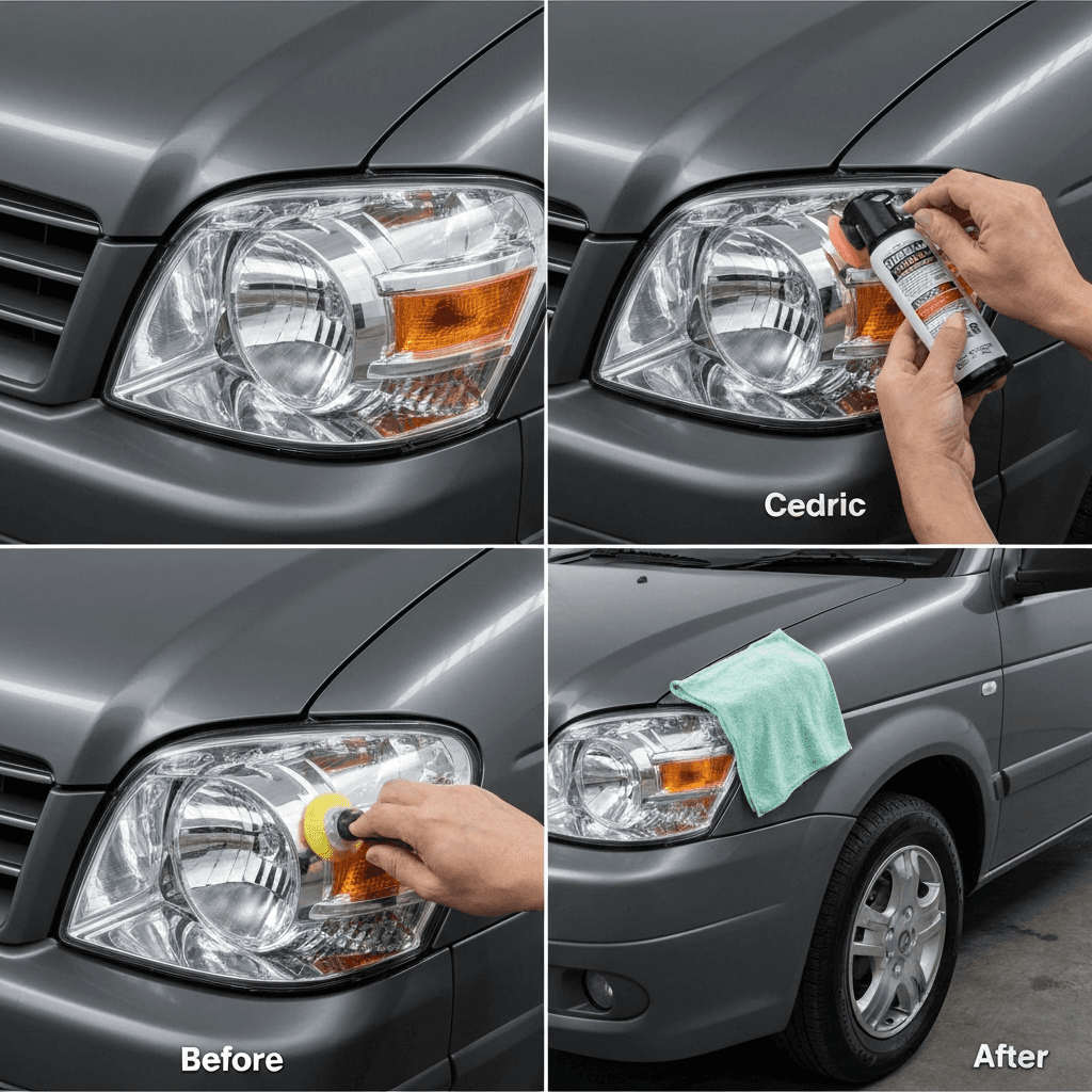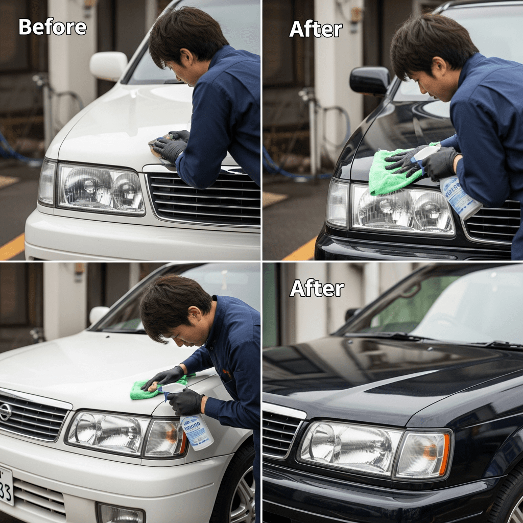 セドリックバンはヘッドライトの黄ばみとボディの鉄粉が第一印象を損ねます。研磨+鉄粉除去クリーナー+ワックスで輝きを取り戻せば「程度良好」と判断され+4~7万円の効果。