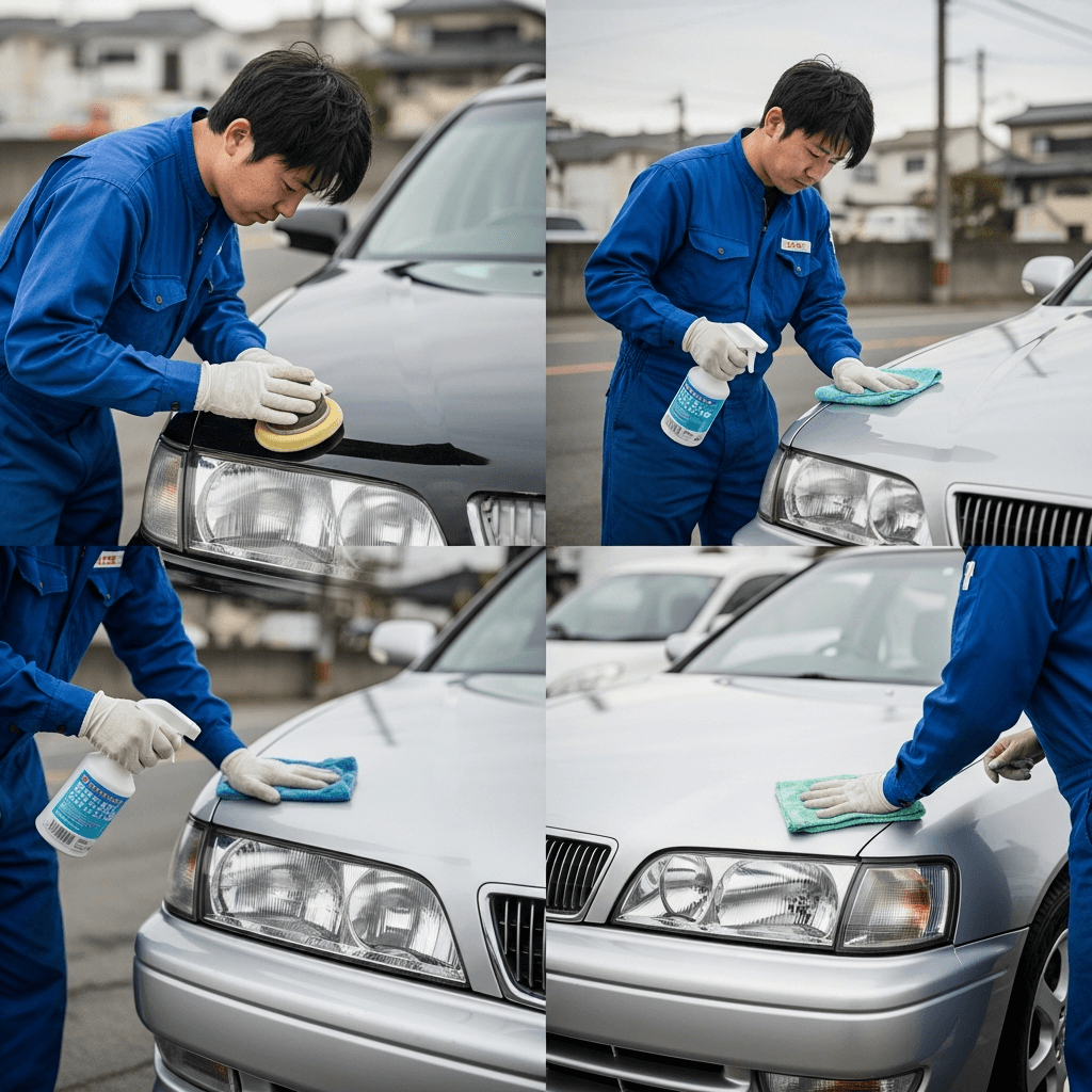 セフィーロワゴンはヘッドライトの黄ばみとボディの鉄粉が第一印象を損ねます。研磨+鉄粉除去クリーナー+ワックスで輝きを取り戻せば「程度良好」と判断され+4~7万円の効果。