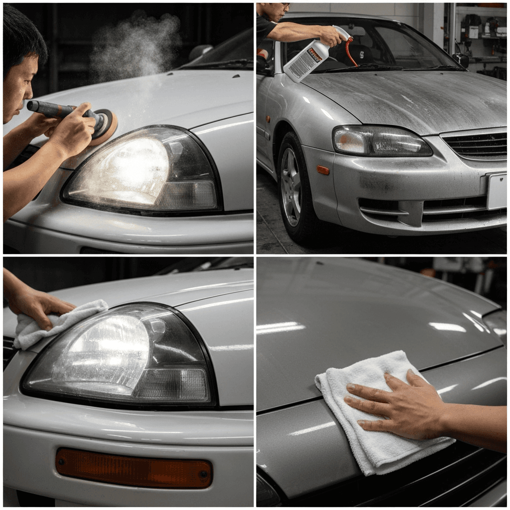 セリカはヘッドライトの黄ばみとボディの鉄粉が第一印象を損ねます。研磨+鉄粉除去クリーナー+ワックスで輝きを取り戻せば「程度良好」と判断され+4~7万円の効果。