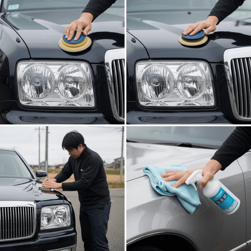 センチュリーはヘッドライトの黄ばみとボディの鉄粉が第一印象を損ねます。研磨+鉄粉除去クリーナー+ワックスで輝きを取り戻せば「程度良好」と判断され+4~7万円の効果。