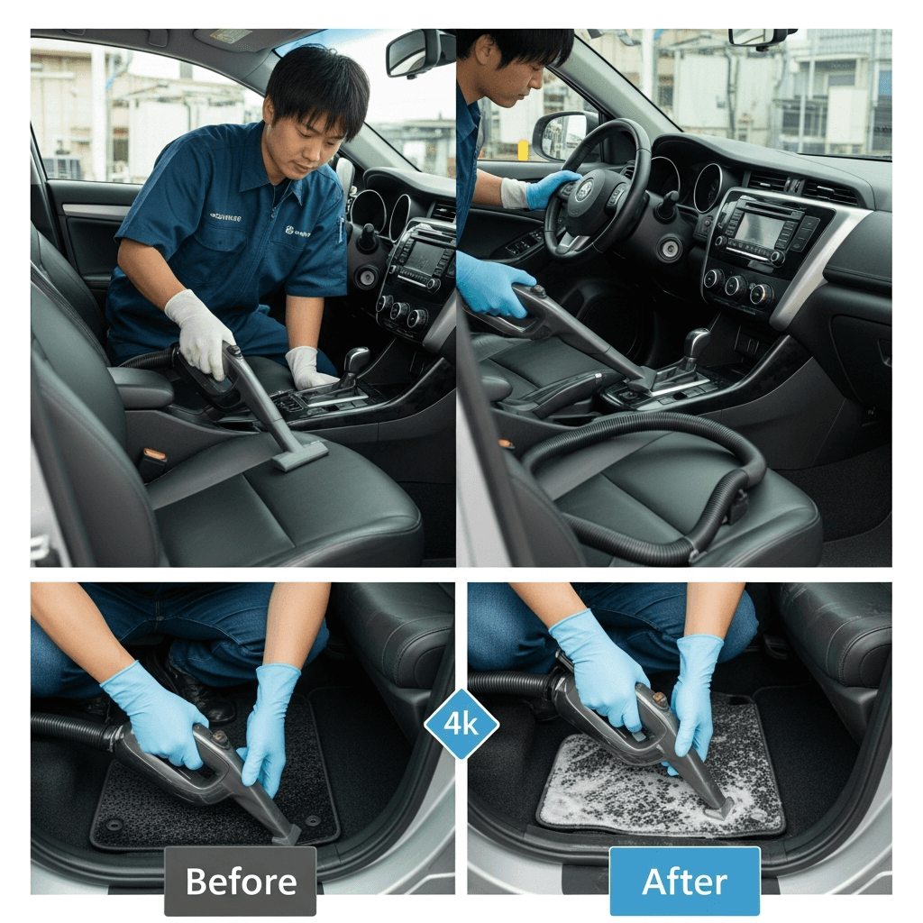 セルボは第一印象が査定の8割を決めます。シート隙間のゴミ除去、マット洗浄、樹脂パーツ艶出しで新車級の清潔感に。特に臭いゼロなら「禁煙車」扱いで+5~8万円UP。