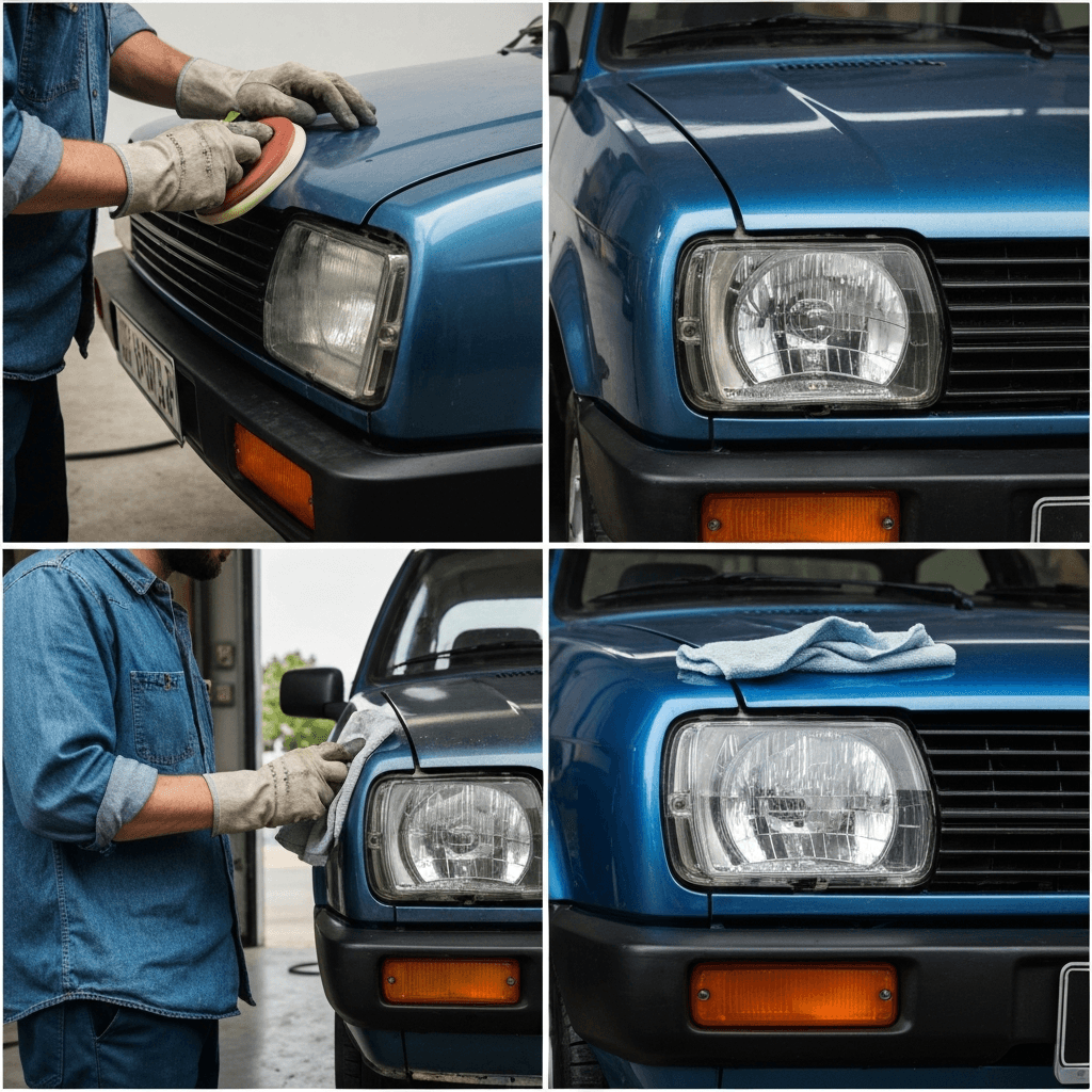 シャレードソシアルはヘッドライトの黄ばみとボディの鉄粉が第一印象を損ねます。研磨+鉄粉除去クリーナー+ワックスで輝きを取り戻せば「程度良好」と判断され+4~7万円の効果。
