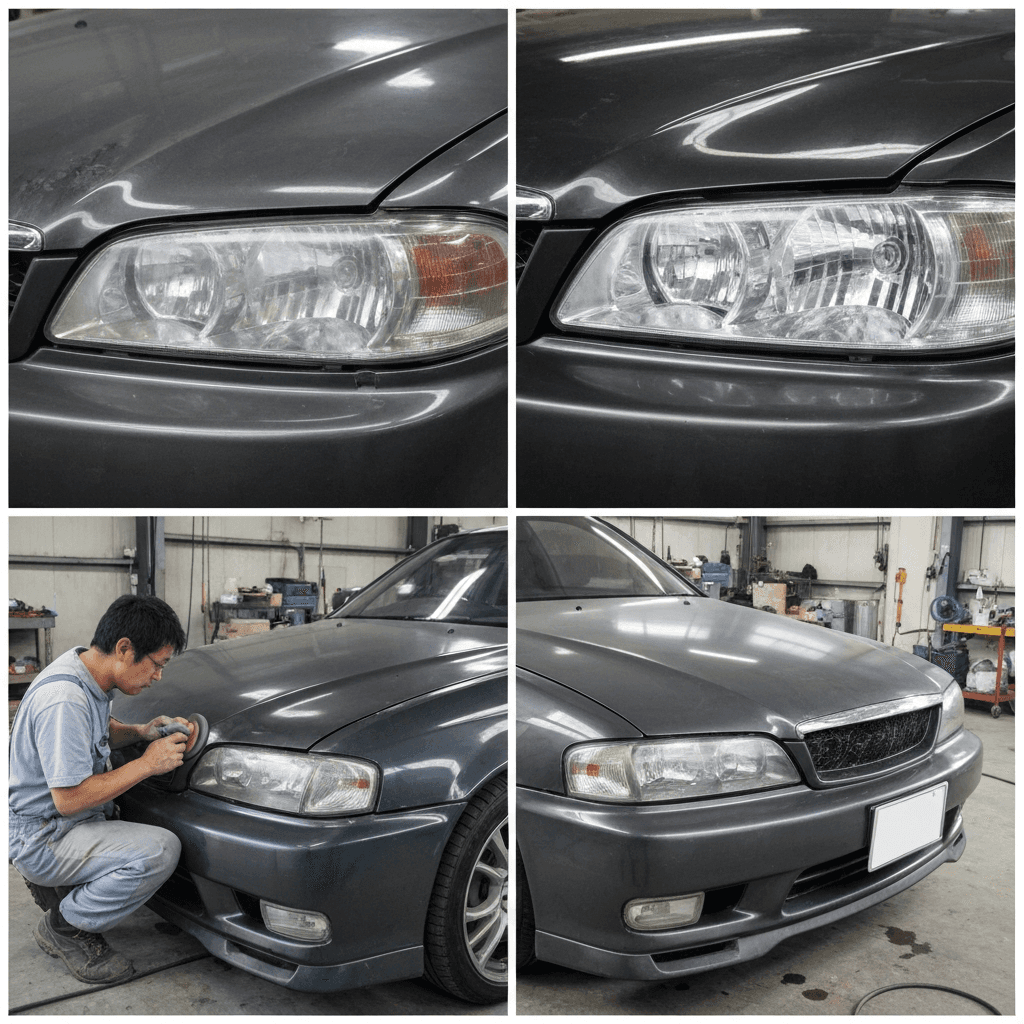 チェイサーはヘッドライトの黄ばみとボディの鉄粉が第一印象を損ねます。研磨+鉄粉除去クリーナー+ワックスで輝きを取り戻せば「程度良好」と判断され+4~7万円の効果。