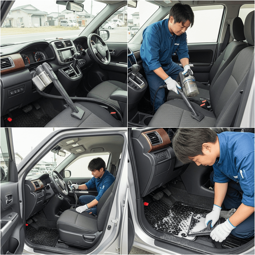 シフォンは第一印象が査定の8割を決めます。シート隙間のゴミ除去、マット洗浄、樹脂パーツ艶出しで新車級の清潔感に。特に臭いゼロなら「禁煙車」扱いで+5~8万円UP。