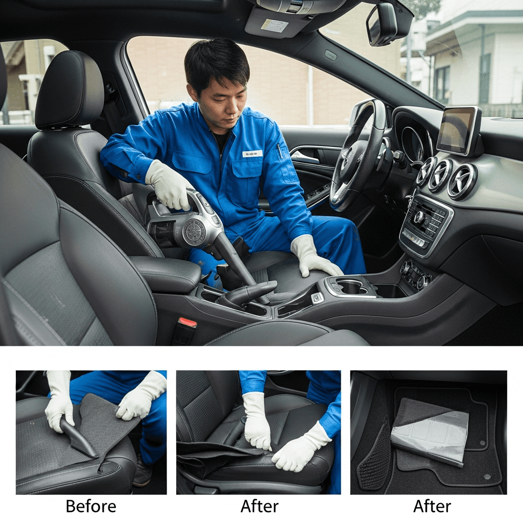 CLAクラスは第一印象が査定の8割を決めます。シート隙間のゴミ除去、マット洗浄、樹脂パーツ艶出しで新車級の清潔感に。特に臭いゼロなら「禁煙車」扱いで+5~8万円UP。