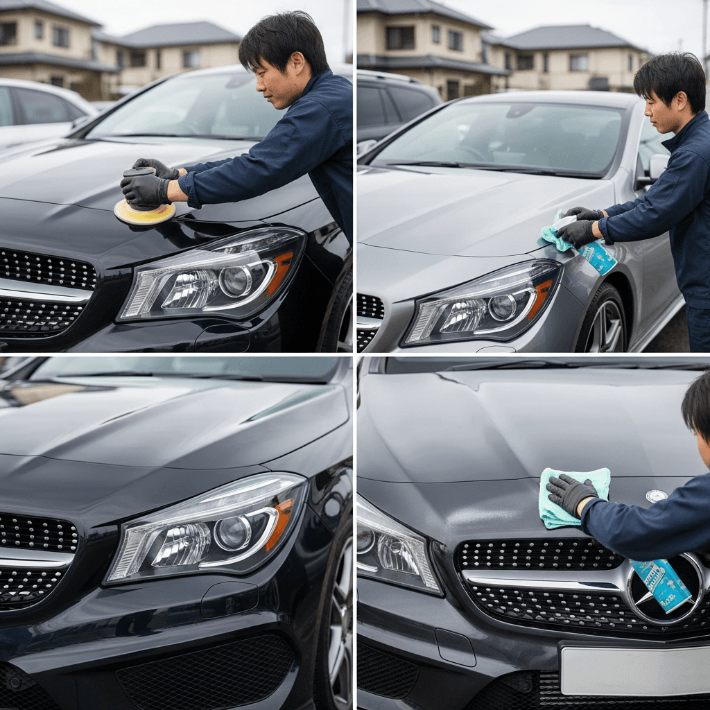 CLAクラスはヘッドライトの黄ばみとボディの鉄粉が第一印象を損ねます。研磨+鉄粉除去クリーナー+ワックスで輝きを取り戻せば「程度良好」と判断され+4~7万円の効果。