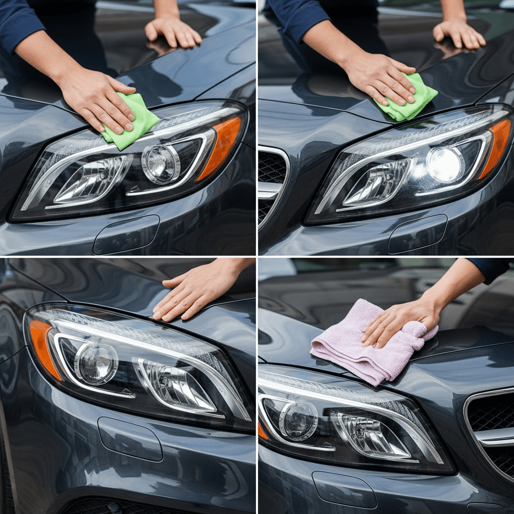 CLAシューティングブレークはヘッドライトの黄ばみとボディの鉄粉が第一印象を損ねます。研磨+鉄粉除去クリーナー+ワックスで輝きを取り戻せば「程度良好」と判断され+4~7万円の効果。