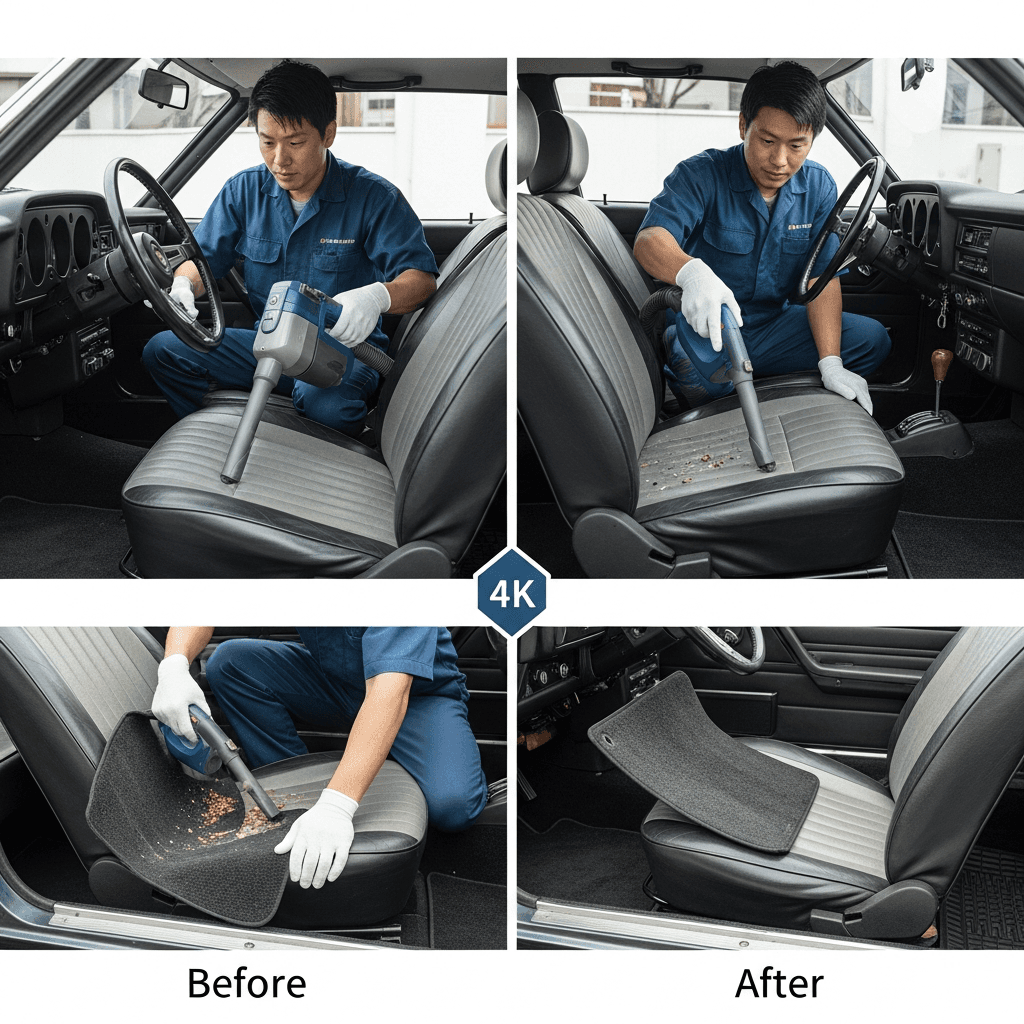 クラシックは第一印象が査定の8割を決めます。シート隙間のゴミ除去、マット洗浄、樹脂パーツ艶出しで新車級の清潔感に。特に臭いゼロなら「禁煙車」扱いで+5~8万円UP。