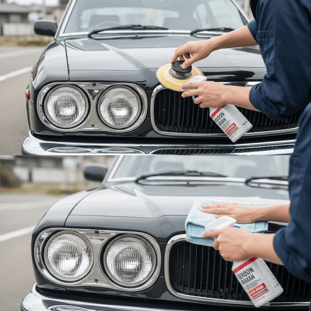 クラシックはヘッドライトの黄ばみとボディの鉄粉が第一印象を損ねます。研磨+鉄粉除去クリーナー+ワックスで輝きを取り戻せば「程度良好」と判断され+4~7万円の効果。