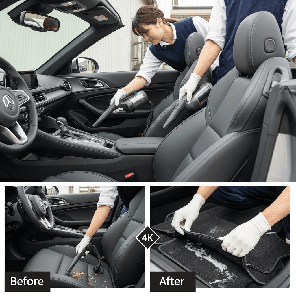 CLEカブリオレは第一印象が査定の8割を決めます。シート隙間のゴミ除去、マット洗浄、樹脂パーツ艶出しで新車級の清潔感に。特に臭いゼロなら「禁煙車」扱いで+5~8万円UP。