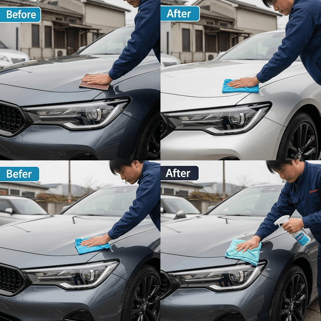 CLEクーペはヘッドライトの黄ばみとボディの鉄粉が第一印象を損ねます。研磨+鉄粉除去クリーナー+ワックスで輝きを取り戻せば「程度良好」と判断され+4~7万円の効果。