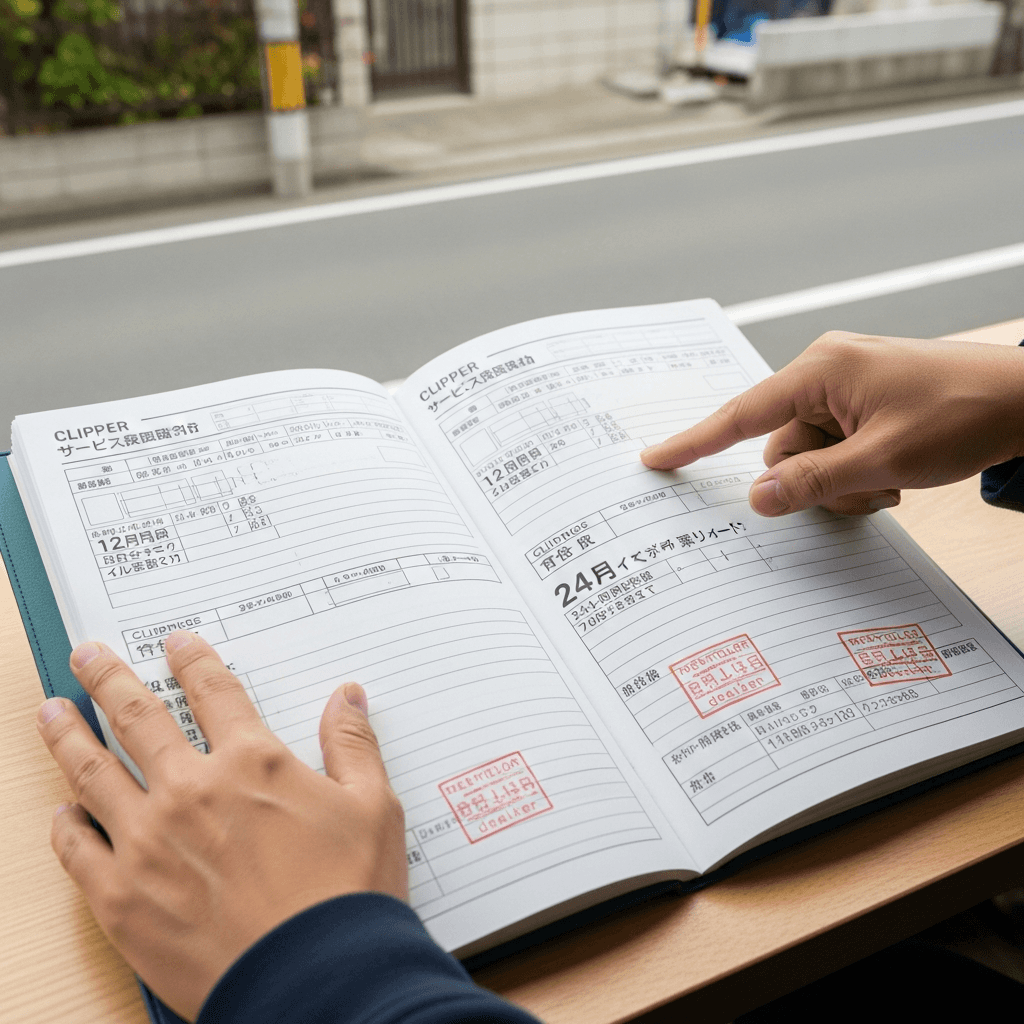 クリッパーの整備記録簿に定期点検(12ヶ月・24ヶ月)の履歴が全て記載されていれば「管理の行き届いた車」と高評価。特にエンジンオイル交換履歴は重要で+6~9万円の効果。