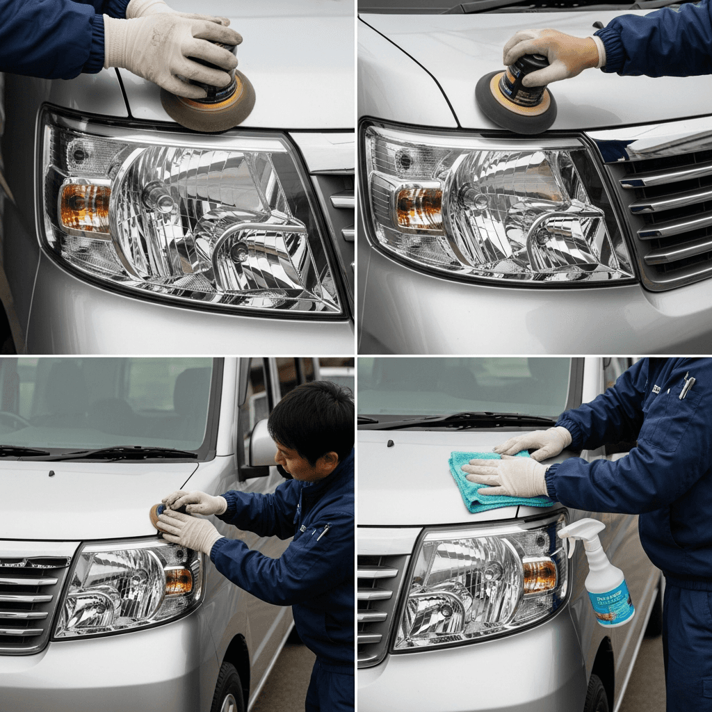 クリッパーはヘッドライトの黄ばみとボディの鉄粉が第一印象を損ねます。研磨+鉄粉除去クリーナー+ワックスで輝きを取り戻せば「程度良好」と判断され+4~7万円の効果。