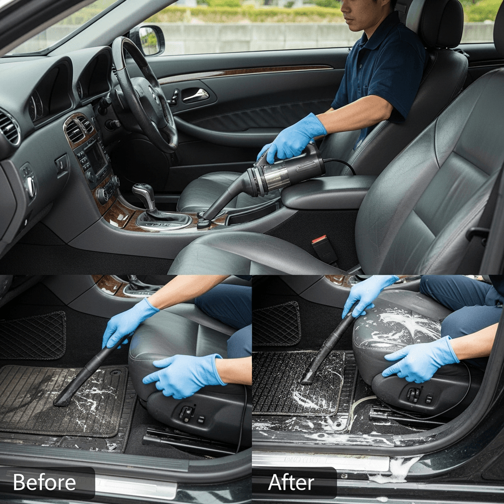 CLKクラスは第一印象が査定の8割を決めます。シート隙間のゴミ除去、マット洗浄、樹脂パーツ艶出しで新車級の清潔感に。特に臭いゼロなら「禁煙車」扱いで+5~8万円UP。