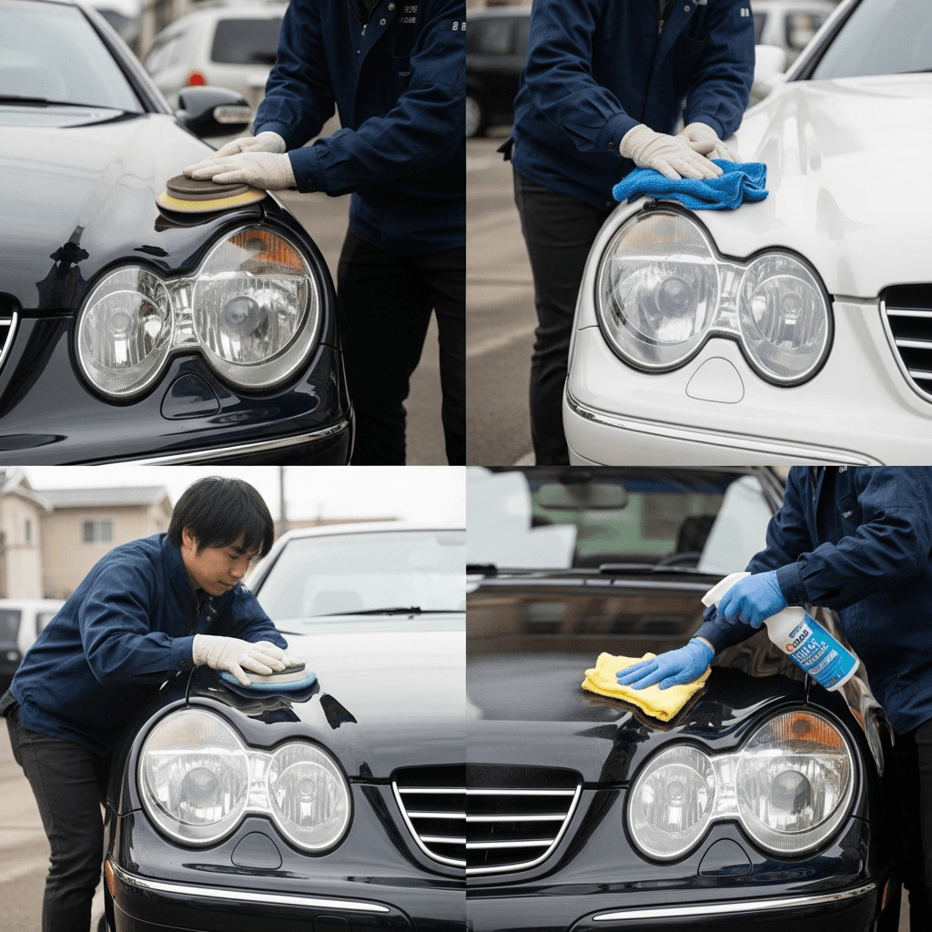 CLKクラスはヘッドライトの黄ばみとボディの鉄粉が第一印象を損ねます。研磨+鉄粉除去クリーナー+ワックスで輝きを取り戻せば「程度良好」と判断され+4~7万円の効果。