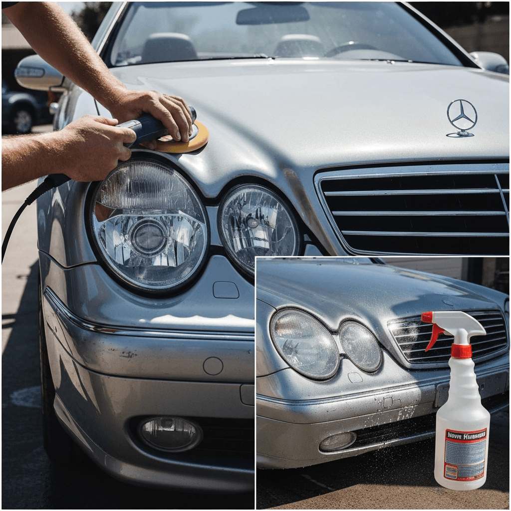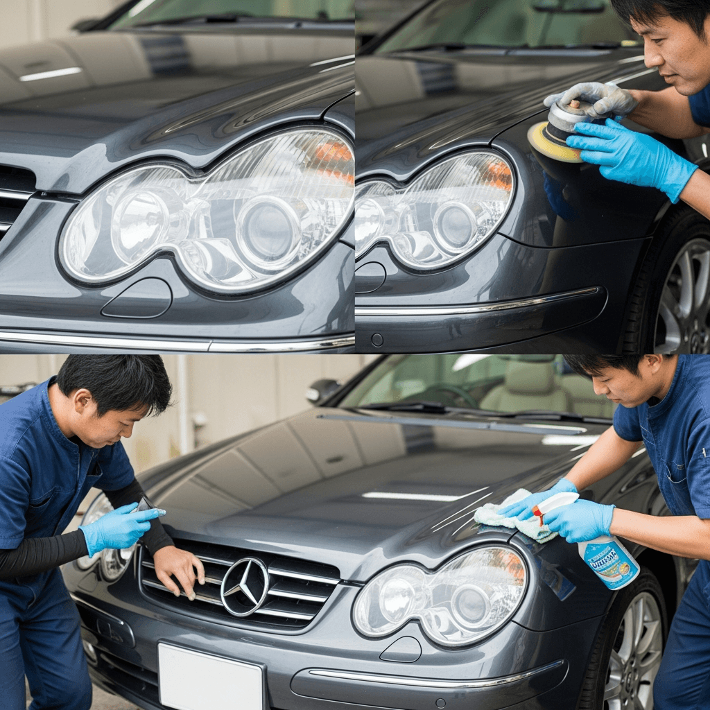 CLKクラスカブリオレはヘッドライトの黄ばみとボディの鉄粉が第一印象を損ねます。研磨+鉄粉除去クリーナー+ワックスで輝きを取り戻せば「程度良好」と判断され+4~7万円の効果。