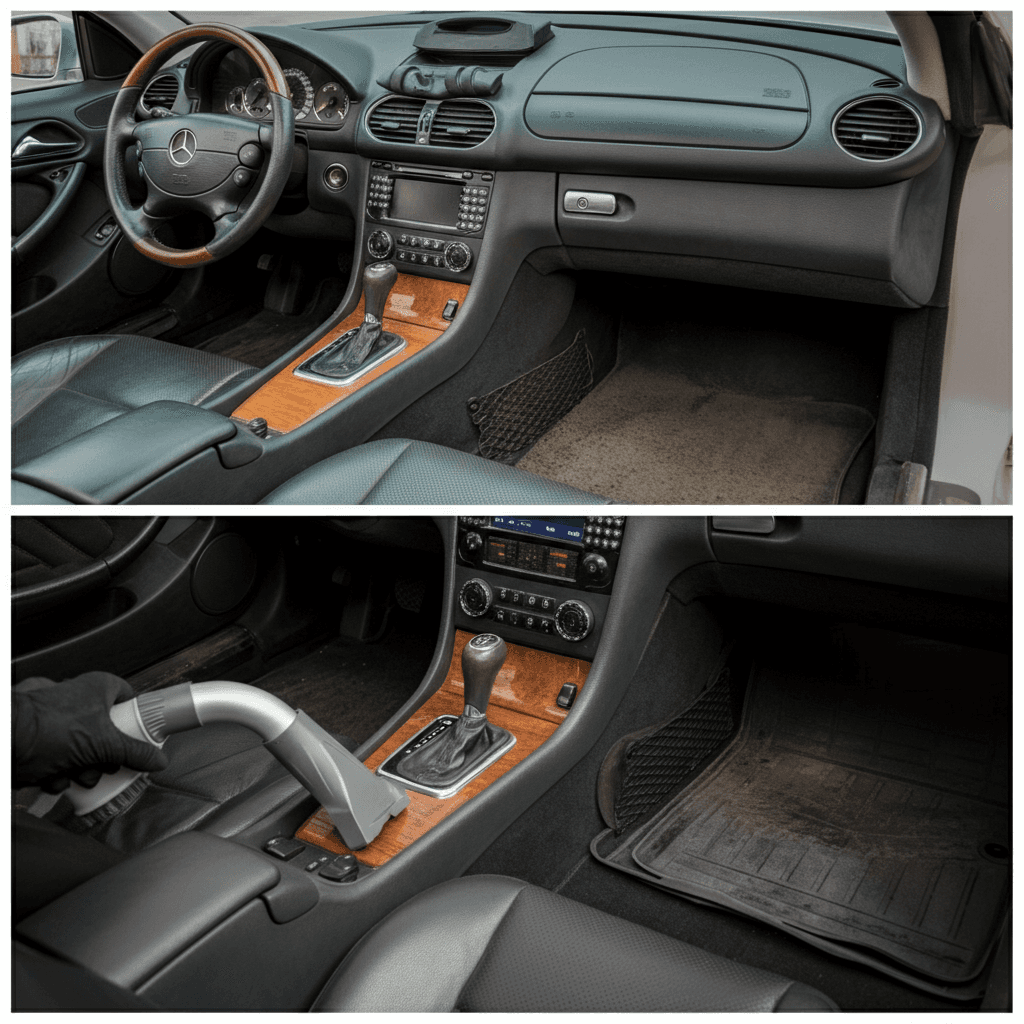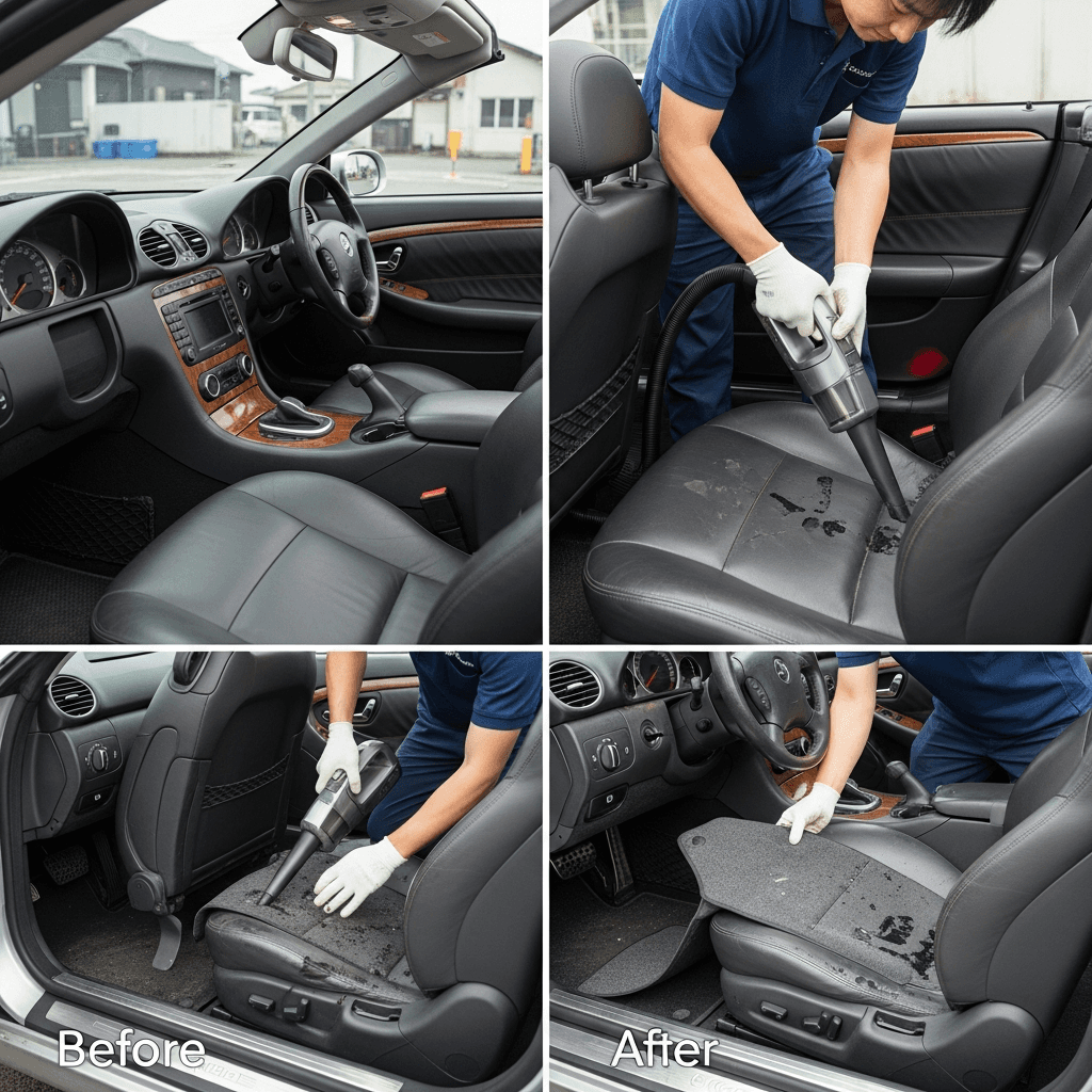 CLKクラスカブリオレは第一印象が査定の8割を決めます。シート隙間のゴミ除去、マット洗浄、樹脂パーツ艶出しで新車級の清潔感に。特に臭いゼロなら「禁煙車」扱いで+5~8万円UP。