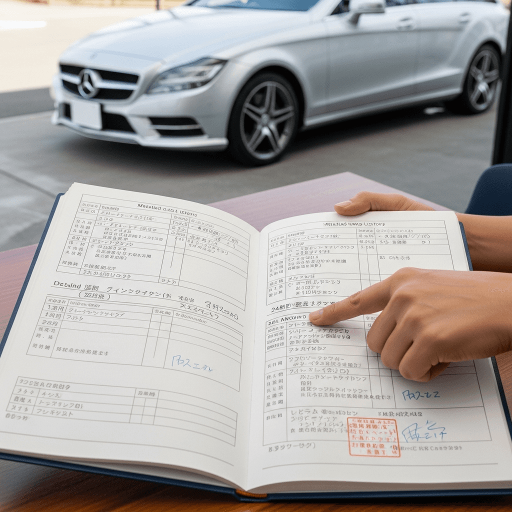 CLSクラスシューティングブレークの整備記録簿に定期点検(12ヶ月・24ヶ月)の履歴が全て記載されていれば「管理の行き届いた車」と高評価。特にエンジンオイル交換履歴は重要で+6~9万円の効果。