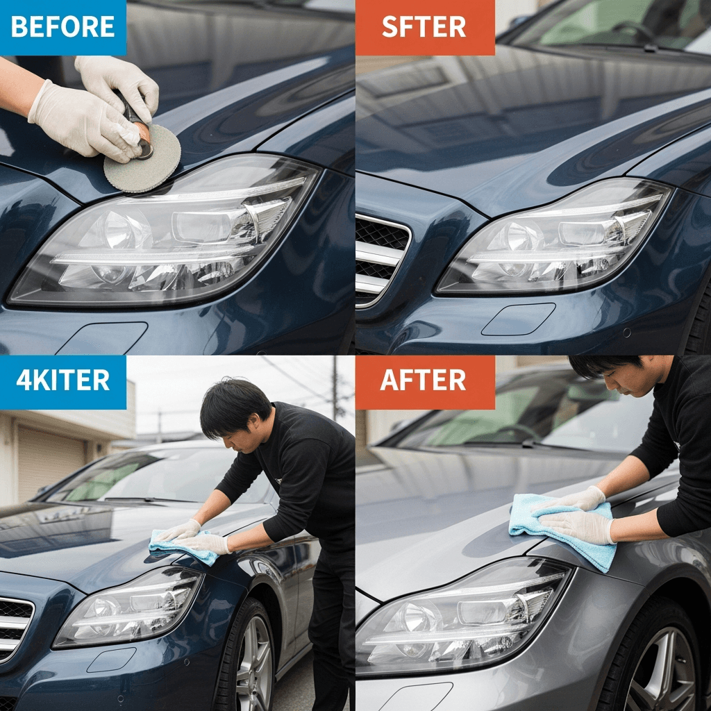 CLSクラスシューティングブレークはヘッドライトの黄ばみとボディの鉄粉が第一印象を損ねます。研磨+鉄粉除去クリーナー+ワックスで輝きを取り戻せば「程度良好」と判断され+4~7万円の効果。