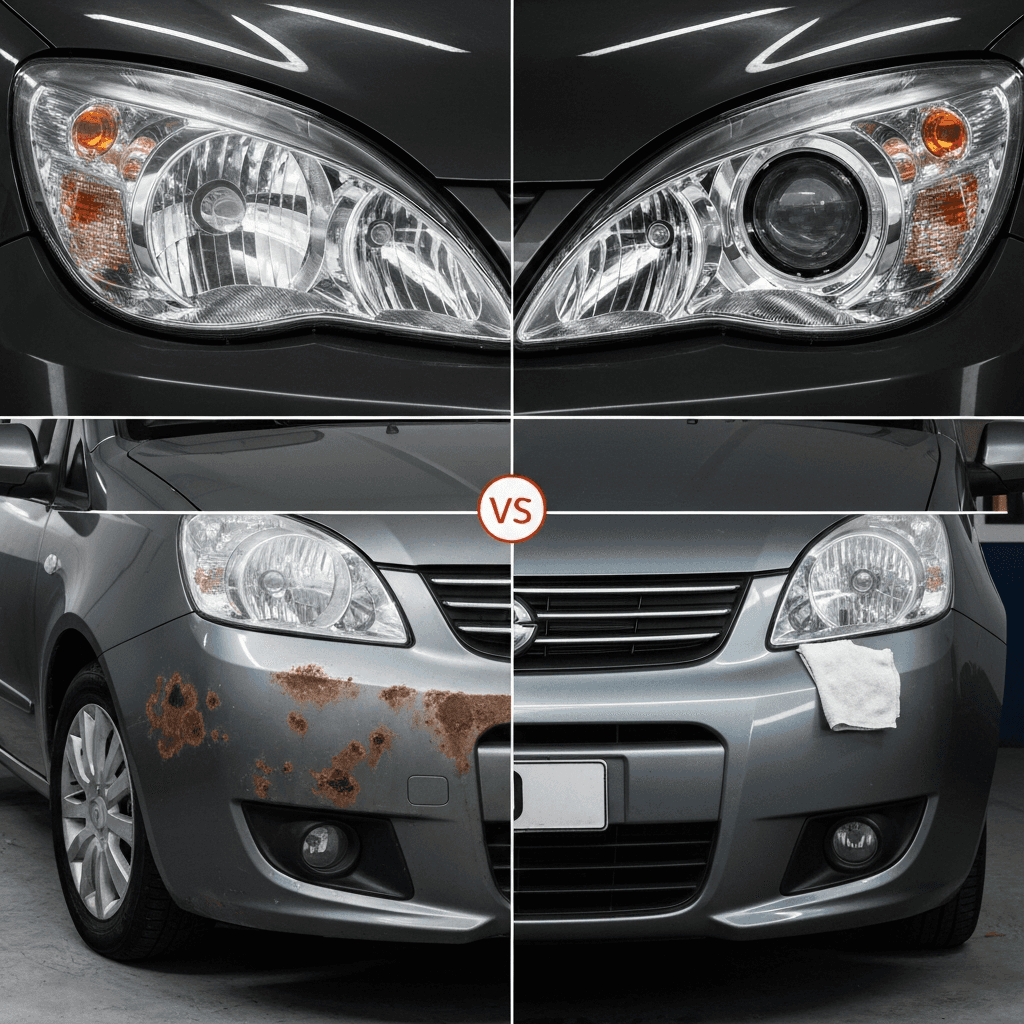 コルトプラスはヘッドライトの黄ばみとボディの鉄粉が第一印象を損ねます。研磨+鉄粉除去クリーナー+ワックスで輝きを取り戻せば「程度良好」と判断され+4~7万円の効果。